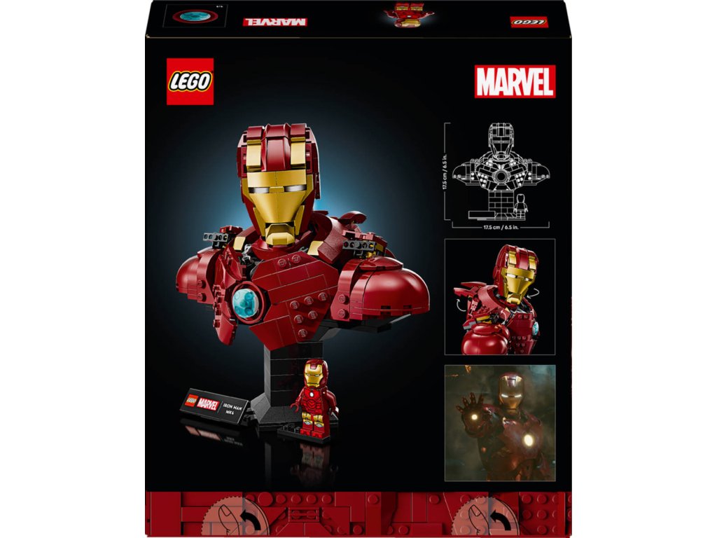 Stavebnice Busta Iron Man MK4 vzdává hold jedné z nejoblíbenějších postav filmového světa Marvel. Model se skládá z 436 dílků a má pevnou základnu. Představuje působivý sběratelský kousek, který potěší zkušené modeláře, fanoušky Marvelu a dospělé milovníky superhrdinů. Tato superhrdinská stavebnice je věrnou replikou ikonického brnění MK4 z filmu Iron Man 2 z dílny studia Marvel. Stavebnice se skládá z 436 dílků a obsahuje dvě nastavitelné klopy na zadní straně, dvě výsuvná ramenní děla a otočnou hlavu. Na pevném podstavci na vystaveni najdete cedulku a odnímatelnou minifigurku Iron Mana. Stavitelé se můžou těšit na obohacující stavitelský zážitek, který doplňuje digitální verze návodu na stavění v aplikaci LEGO Builder. Model obsahuje 436 dílků.