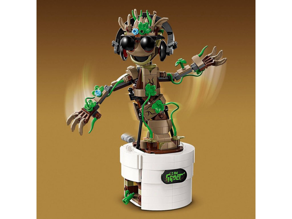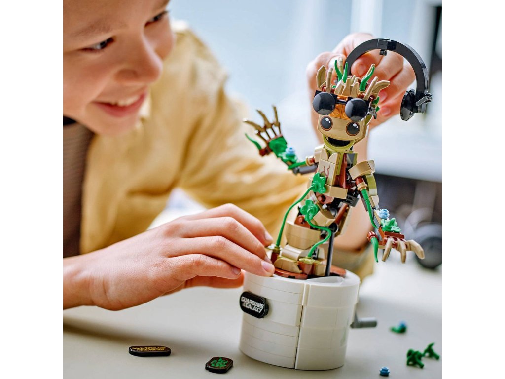 Stavebnice Tančící Groot ze světa Strážců Galaxie přináší interaktivní taneční funkcí. Jedná se o skvělý dárek pro děti od 10 let, fanoušky marvelovské postavičky Groota, superhrdinů a sestavitelných hraček LEGO. Model Groota pro děti má pohyblivou hlavu a pohyblivé paže. Když děti otočí držadlem na zadní straně květináče, kloubový Groot začne tančit. Figurku lze přizpůsobit pomocí doplňkových listů, sestavitelných sluchátek a slunečních brýlí a děti si mohou přizpůsobit Grootův květináč přidáním 1 ze 3 různých popisků na přední stranu (včetně jedné související s televizním seriálem Já jsem Groot). Veškeré toto příslušenství lze uložit do vestavěné přihrádky květináče. Aby bylo stavění modelu ještě zábavnější, aplikace LEGO Builder dětem umožňuje přibližovat a otáčet modely ve 3D a průběžně sledovat postup stavění.