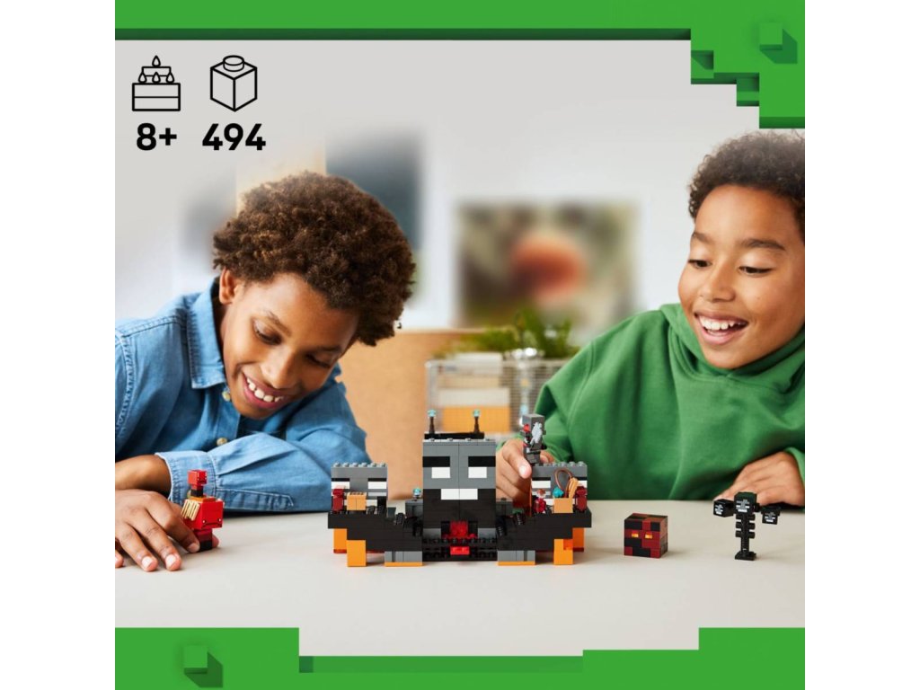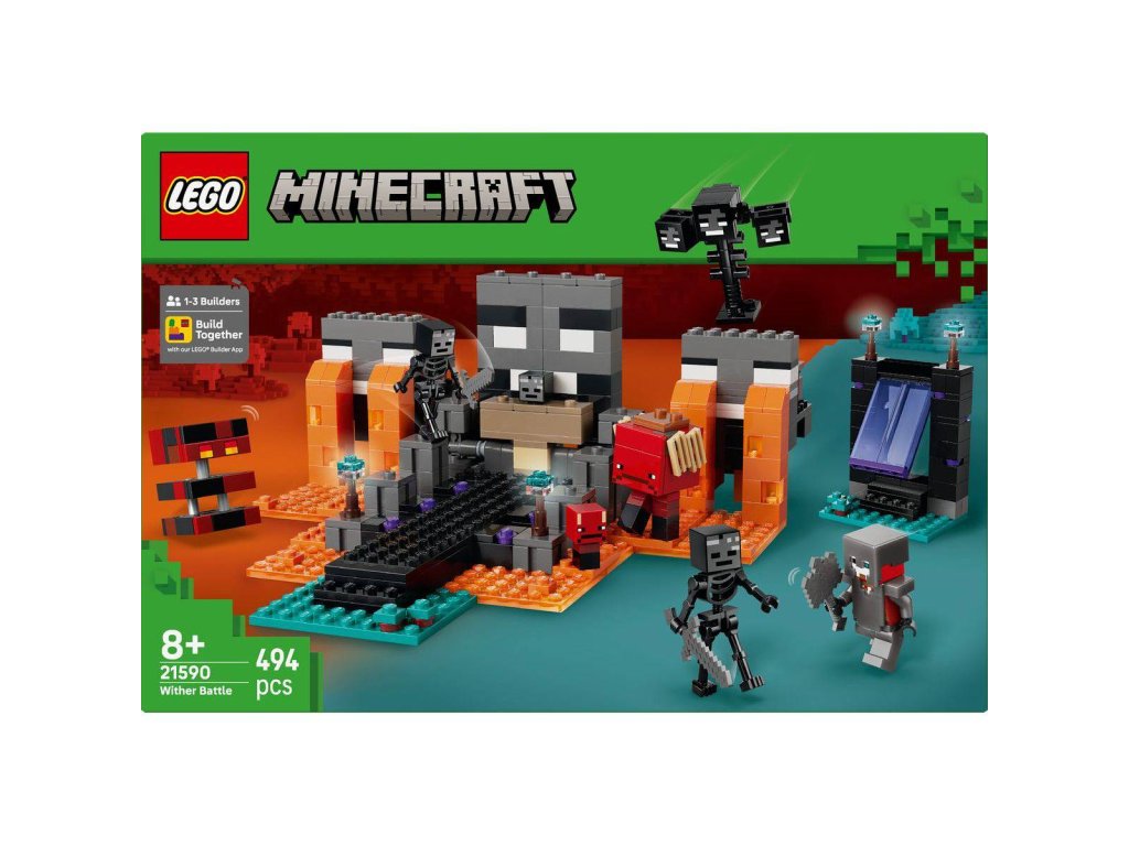 Vydejte se s milovníky Minecraftu do nekonečného světa fantazie se stavebnicí Souboj s Witherem pro holky a kluky od 8 let. Děti se připojí ke karmínovému válečníkovi, který se v deštivém lesním biomu utká se dvěma kostlivci a dalšími nepřáteli a čeká ho napínavé dobrodružství. Tato stavebnice plná akce a autentických detailů ze hry Minecraft obsahuje postavy ze hry, jako je karmínový válečník, 2 Wither kostlivci, chodec, pekelný sliz a sestavitelný Wither. Portál do Netheru a svatyně s pracovním stolem a skrytým Witherem, kterého můžou děti vyvolat výbuchem, vnáší do hry život. Děti si užijí hodiny nápaditého hraní, při kterém budou bojovat s nepřáteli, jezdit na chodci a prožívat velkolepá dobrodružství.