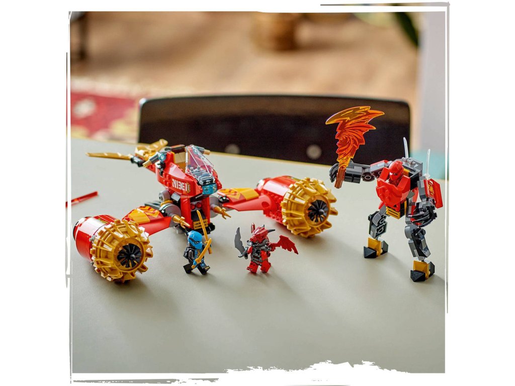 S kombinovanou nindžovskou stavebnicí Kaiův bouřný jezdec a robot si kluci a holky od 7 let připomenou napínavé scény ze 3. řady televizního seriálu NINJAGO Dračí povstání. Děti si můžou s velkou akční stavebnicí hrát a poté ji rozdělit na 2 menší vozidla: Kaiova robota s pohyblivou hlavou, rukama a nohama, kokpitem a velkou bouřnou čepelí a Nyinu létající motorku s kokpitem, pohyblivými křídly a 2 pružinovými vystřelovači. Tato stavebnice s nindžovským vozidlem obsahuje 3 minifigurky NINJAGO: Kaie vyzbrojeného 2 křišťálovými katanami, Nyu se 2 zlatými katanami a zlotřilého dračího bojovníka s vlastním mečem, se kterými si děti užijí napínavé bitvy.