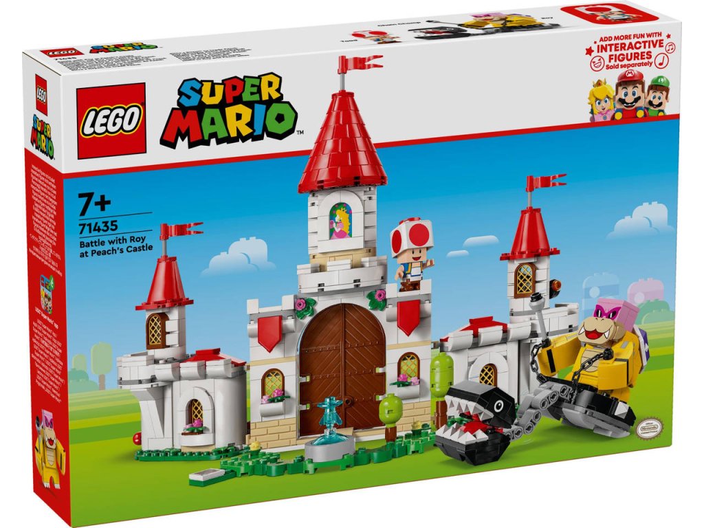 Se setem LEGO Super Mario Bitva s Royem na hradě Peach se děti mohou těšit na hodiny objevování, bojování a přehrávání příběhů ze slavné lokality ze světa hry Super Mario. Tento set s postavičkami Nintendo představuje skvělý dárek pro holky, kluky a milovníky videoher od 7 let a součástí je model hradu princezny z kostek LEGO, který lze otevřít pro snadnější přístup během herních dobrodružství. Má snadno přestavitelné zdi, které se při obléhání rozpadnou, věž, katapult, otočný trůn a fontánu na zahradě. Součástí jsou také 3 figurky LEGO Super Mario: Roy (poprvé v setu LEGO Super Mario), Chain Chomp a Toad. Přidejte figurku LEGO Mario, LEGO Luigi nebo LEGO Peach (ze setů 71439, 71440 a 71441 – prodávají se samostatně) a užijte si interaktivní hraní. Pomozte jim porazit Roye a převzít kontrolu nad jeho Chain Chompem, najděte skryté akční prvky a odemkněte digitální reakce, jako je klavírní hudba. Návod na stavění najdete v krabici a v aplikaci LEGO Super Mario, která je navíc plná kreativních nápadů na stavění a hraní.