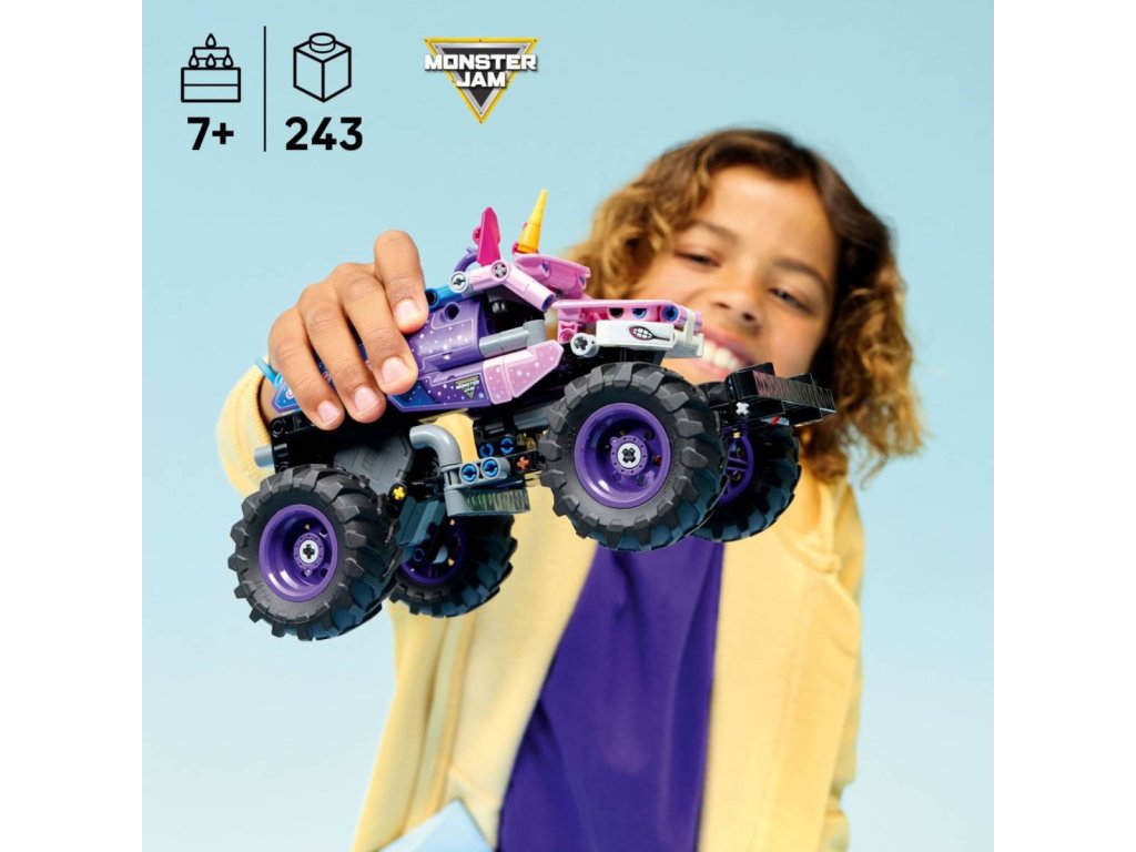 Připomeňte si napínavou akci Monster Jam s touto hračkou pro holky a kluky od 7 let. Využijte parádní natahovací funkci, rozpohybujte truck Sparkle Smash na plné obrátky a napodobte úžasné kaskadérské kousky, které předvádějí legendární monster trucky. Tato detailně propracovaná hračka v podobě monster trucku s jednorožcem má autentické designové detaily, jako jsou třpytivé hvězdy a ikonický roh jednorožce inspirovaný skutečným truckem Sparkle Smash. Tato stavebnice monster trucku je vhodná jako dárek pro holky i kluky a poslouží jako zábavný dárek pro všechny milovníky vozidel LEGO®, hraček s motivem jednorožců, natahovacích autíček a napínavé akce Monster Jam, při které se divákům tají dech.