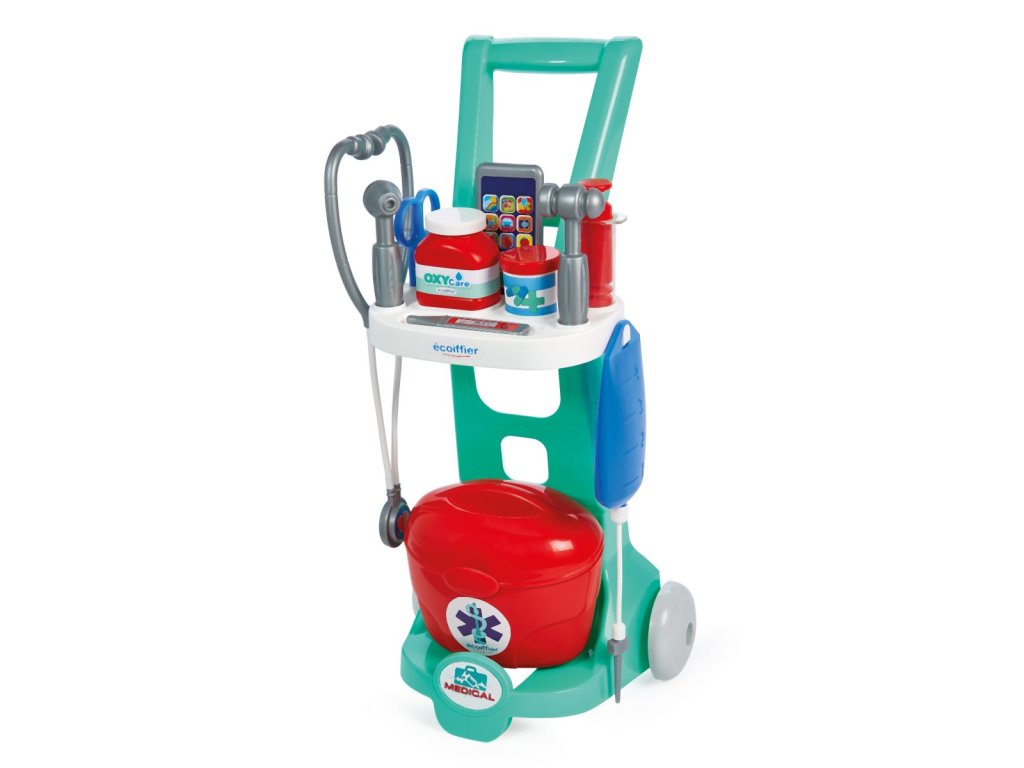 Vozík pro malé lékaře zahrnuje lékařský kufřík, stetoskop, infuzi a další příslušenství - stříkačku, teploměr, nůžky atd. pro zjištění zdravotního stavu pacienta. Výška vozíku je 56 cm. Hmotnost 1,085 kg.