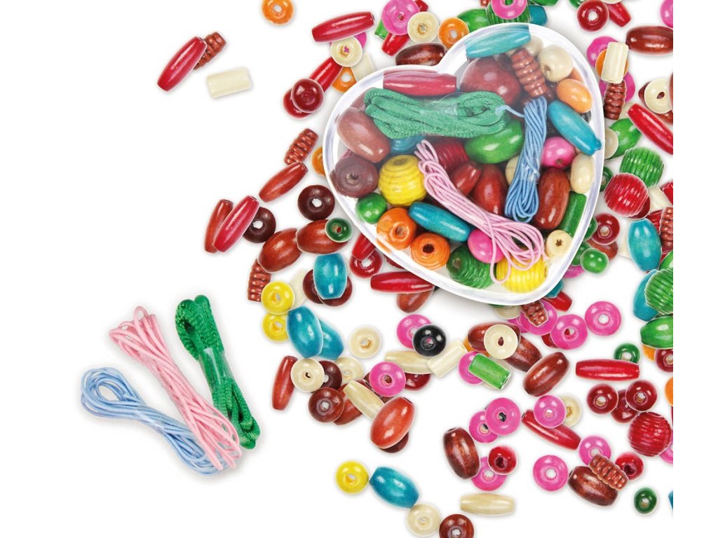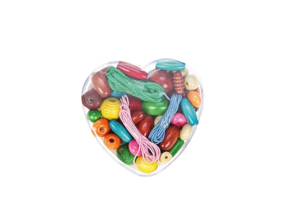 Dřevěné korálky různých barev a tvarů o velikosti 9,5 mm jsou umístěny v malém čirém srdíčku a doplněny o tři navlékací šňůrky. Hlavní vlastnosti: podporuje kreativitu a jemnou motorikupestrobarevné provedení