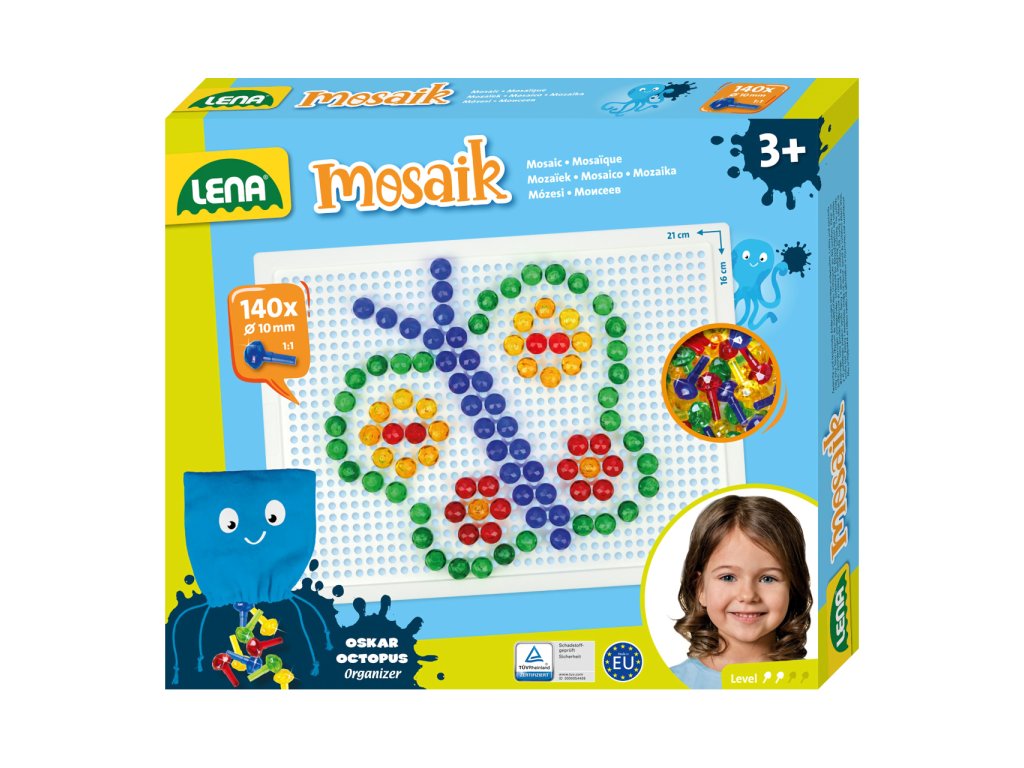 Nechejte se unést pestrými barvami kloboučků, jsou jako drahokamy! Pomocí mozaiky mohou děti rozvíjet svou fantazii, soustředění a jemnou motoriku. Souprava obsahuje desku a sadu malých průhledných kolíčků v plátěném pytlíku s motivem chobotničky. Vyrobeno z nezávadného a odolného plastu. Hlavní vlastnosti:deska o rozměrech 21×16 cm a 140 malých kolíčkůstřední obtížnostpraktické balení