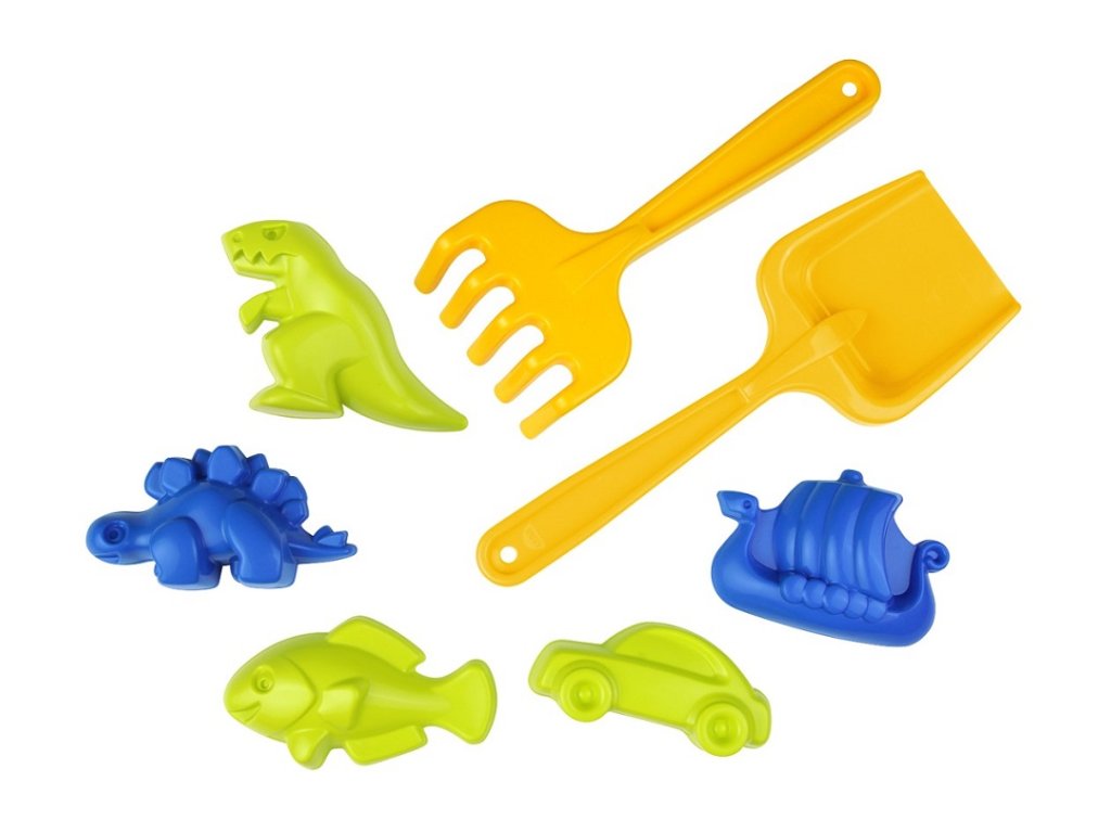 Sada obsahuje 7 dílů pomůcek na písek a to hrábě, lopatku a 5 ks formiček (2x dinosaurus, 1x autíčko, 1x rybka, 1x lodička). Sada je vyrobena z kvalitního materiálu, která je bezpečná pro děti. Je navržena pro děti od 1 roku věku, což zajišťuje bezpečné a zábavné hraní pro nejmenší děti. Podněcuje děti k rozvoji jejich kreativity, zručnosti a také fantazie jak na pískovišti, tak na pláži. Hlavní vlastnosti: vhodné i pro nejmenší 1+pomáhá rozvíjet zručnost a koordinacipodporuje kreativitu a představivostideální na zahradu nebo plážvyrobeno v ČR