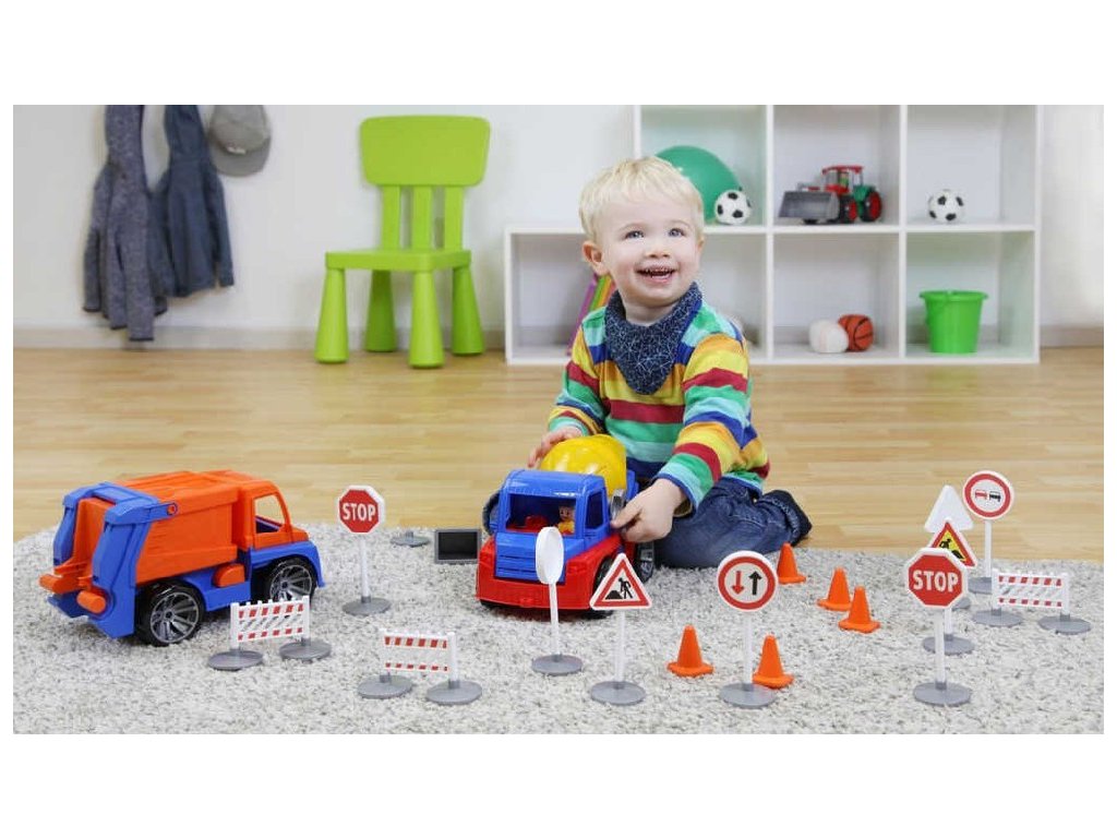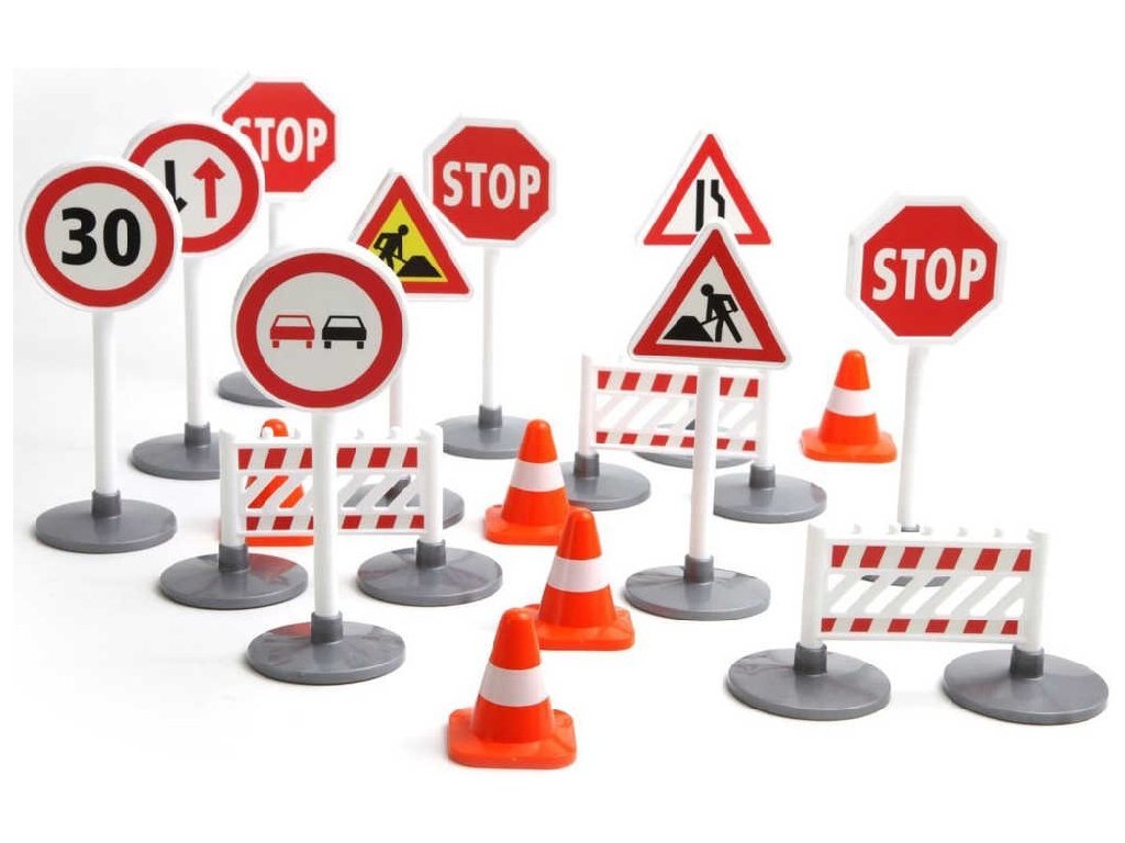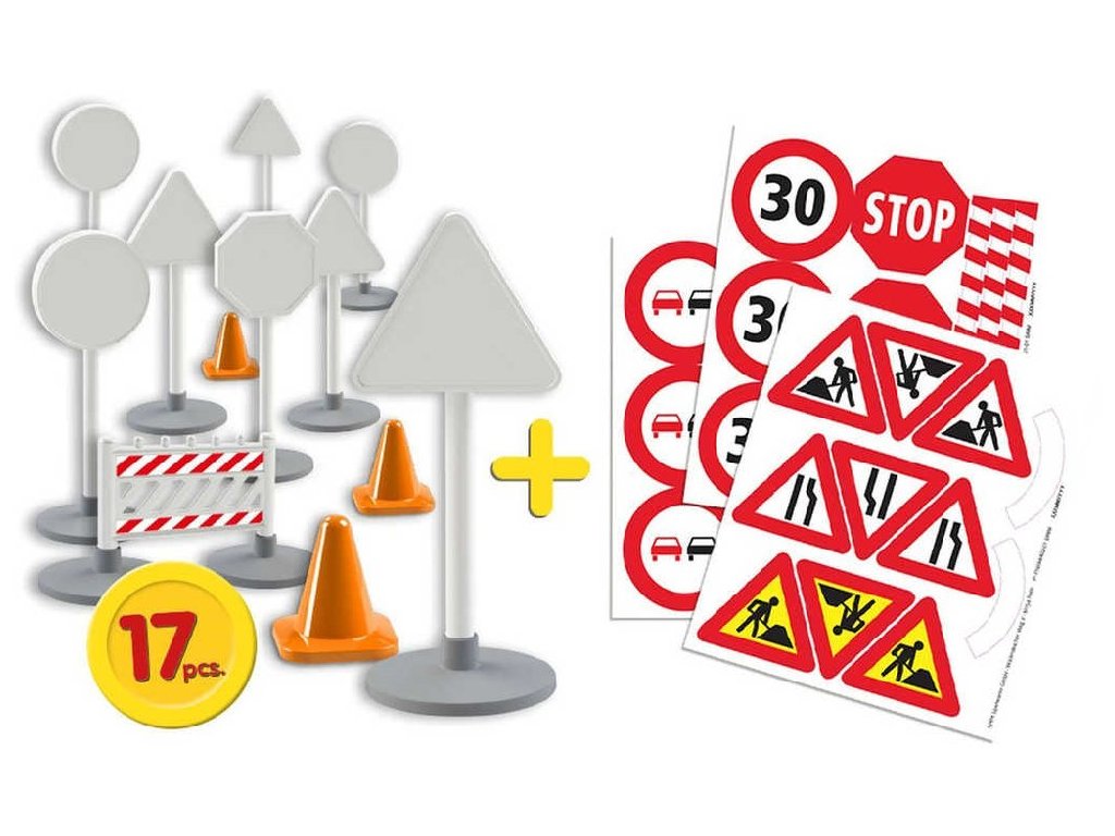 Obsah balení: 17 druhů dopravního značení (značky, polepky na značky, kužely, zábrany)