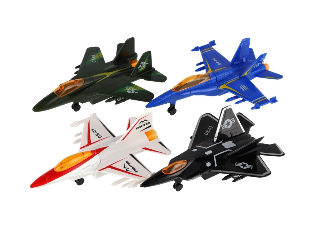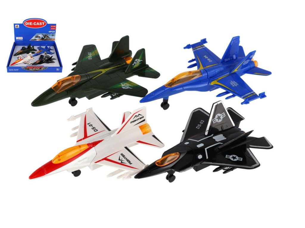 Letadlo/stíhačka kov/plast 16cm na zpětné natažení 4 barvy 4ks v boxu