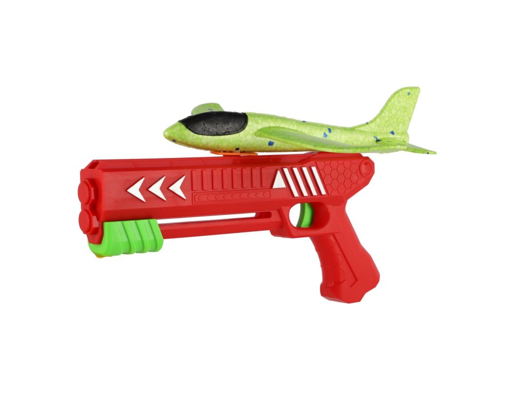 Zábavné vystřelovací letadlo z lehké pěny, které děti odpálí pomocí plastové pistole. Stačí nasadit letadlo na držák, stisknout spoušť a sledovat, jak vystřelí do vzduchu! Díky lehkému materiálu letadlo krásně plachtí a je bezpečné i pro menší děti.