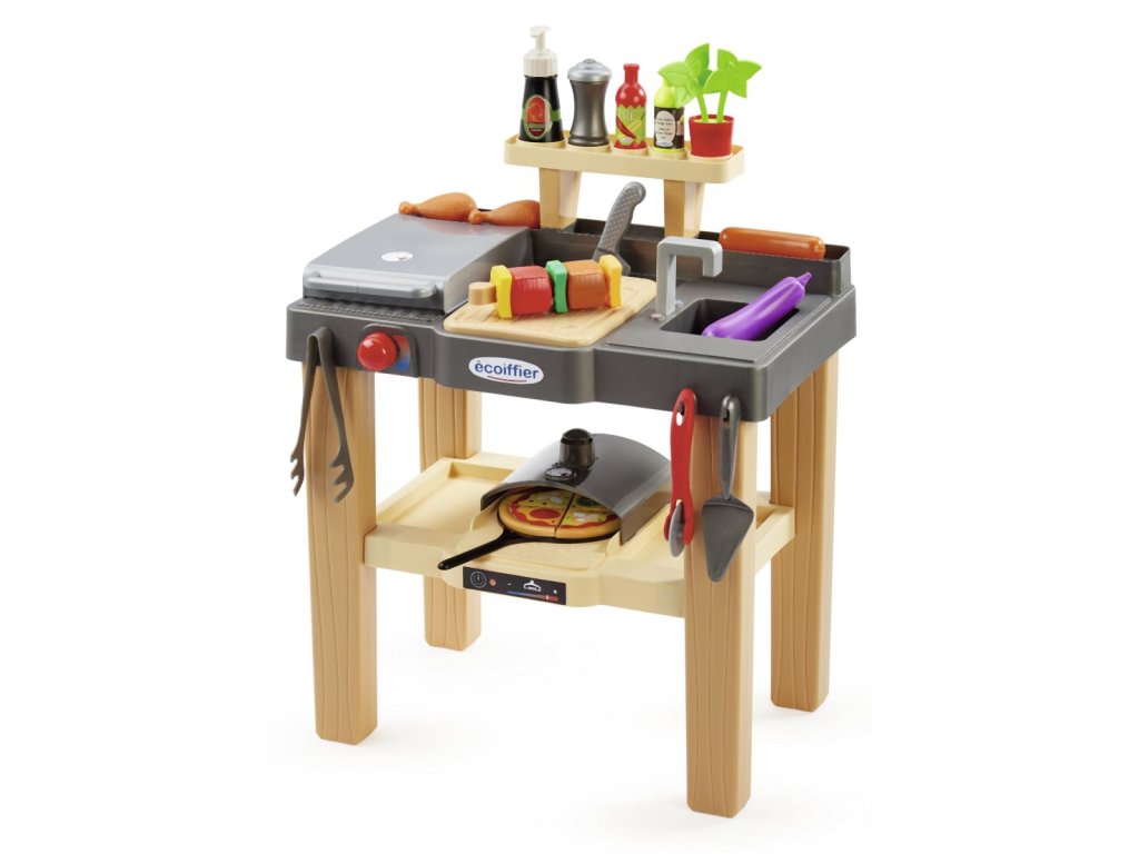 Letní zahradní kuchyňka s pecí na pizzu od Ecoiffier nabízí vše, co potřebují malí kuchaři. Tato kuchyně je vybavená pecí na pizzu, placha grilem, prkénkem a dřezem. Součástí je četné příslušenství a potraviny. Rozměry produktu (DxŠxV): 49 x 32 x 55 cm.