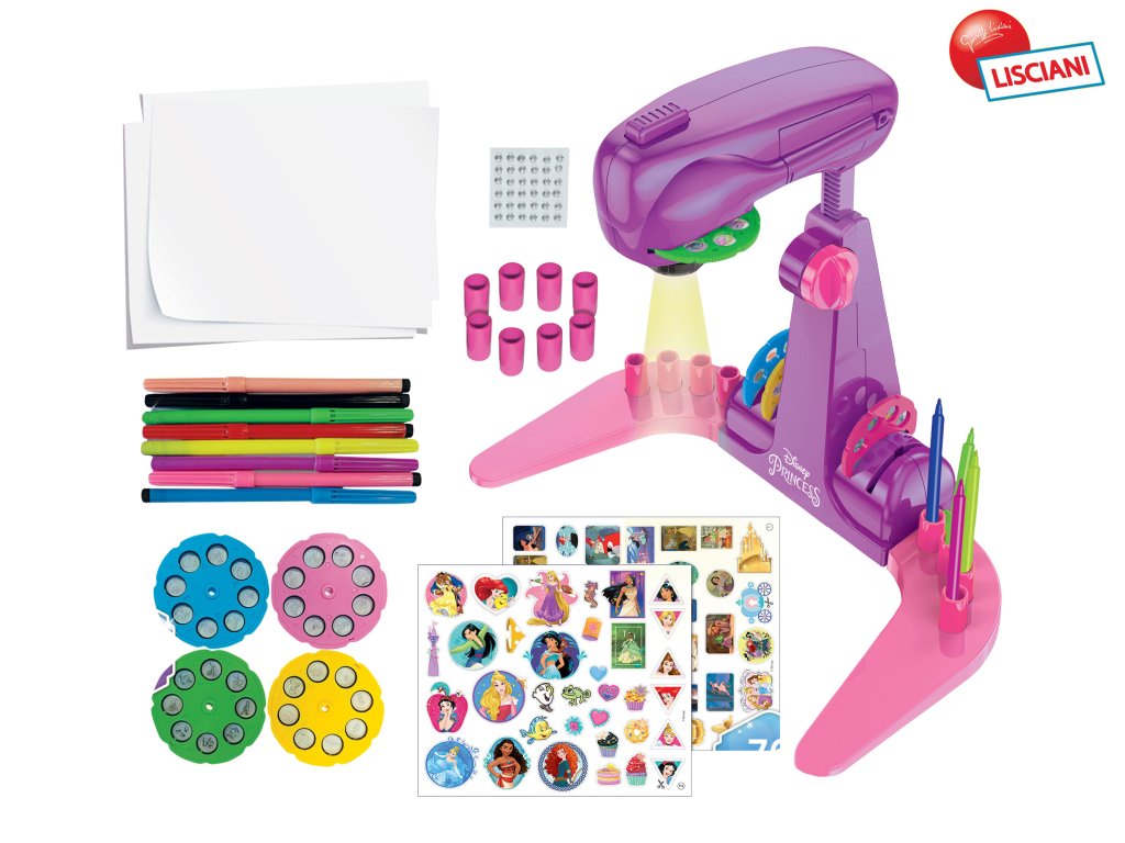 Lisciani projektor šablon s obrázky Disney princezen na kreslení. Balení obsahuje projektor, 4 disky s šablonami (32 obrázků), 36 dekoračních kamínků, 76 samolepek, 8x barevný fix. Projektor - 3 xAA baterie nejsou součástí.