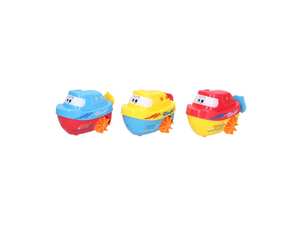 Loď do vody. Na natažení. Velikost 10,5 cm. 6 ks display box. 3 varianty - červená, modrá, žlutá.
