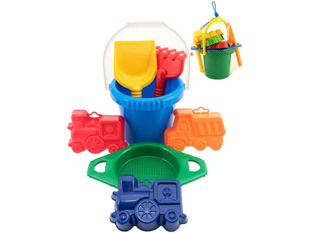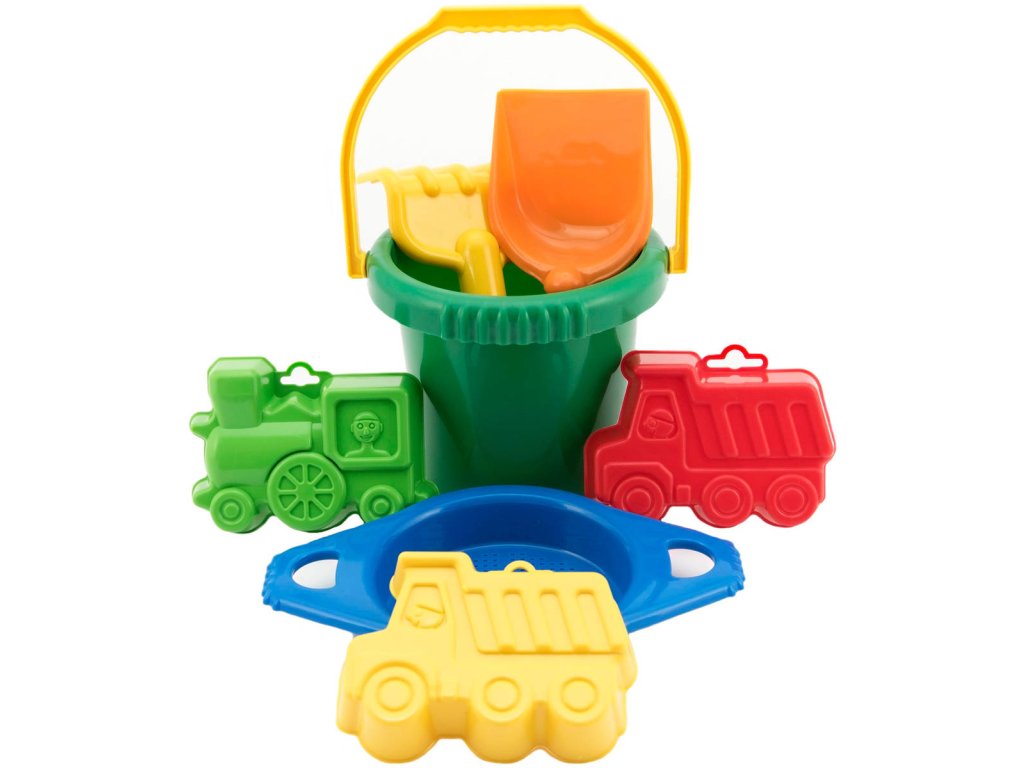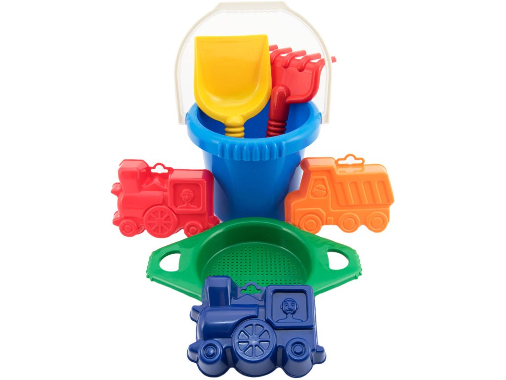 Sada obsahuje: kyblík, sítko, 3 bábovky (mašinka, nákladní auto, bábovka), hrabičky, lopatka.