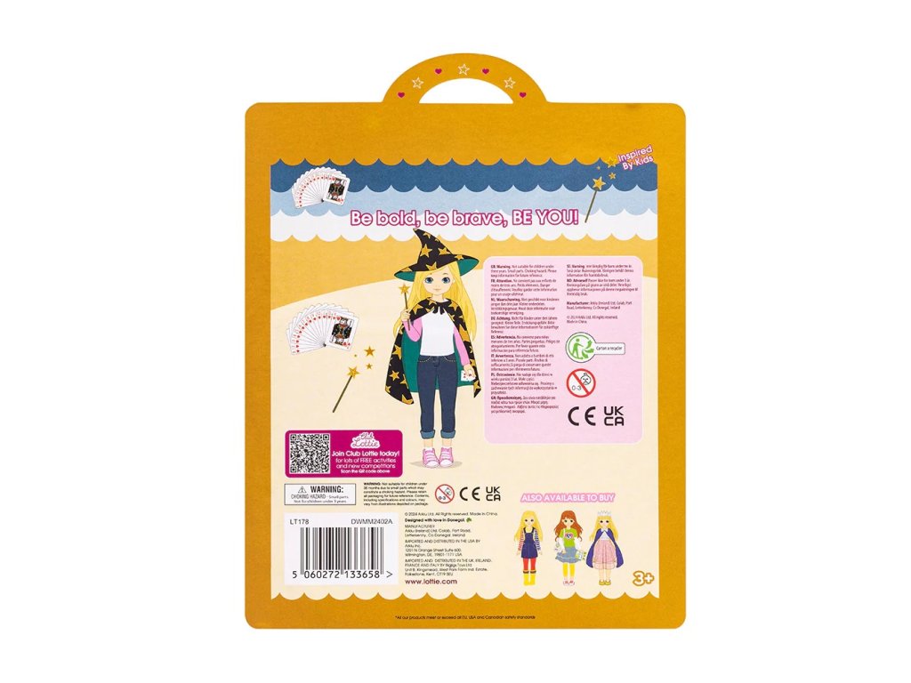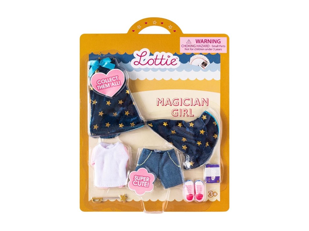 Abrakadabra alakazam! Malí kouzelníci mohou předvádět okouzlující čarodějnické show s touto sadou oblečení a doplňků. Ale není to jen o provádění triků! Prostřednictvím interaktivní hry děti rozvíjejí svou kreativitu, představivost a sociální dovednosti, když spolupracují s přáteli na vymýšlení a předvádění vzrušujících iluzí. Oblečení pro panenku je vyrobeno z příjemné, pevné látky, které pasuje na všechny panenky Lottie. Mohou si tak mezi sebou oblečení měnit. Panenka není součástí balení. Balení obsahuje: kloboukplášť s hvězdným potiskemtričkokraťasyrůžové teniskyzlatou hůlkubalíček karet Hlavní vlastnosti sada oblečení a doplňků kouzelniceoceňovaná a inkluzivní značkavhodné od 3 let věkupanenka není součástí balení
