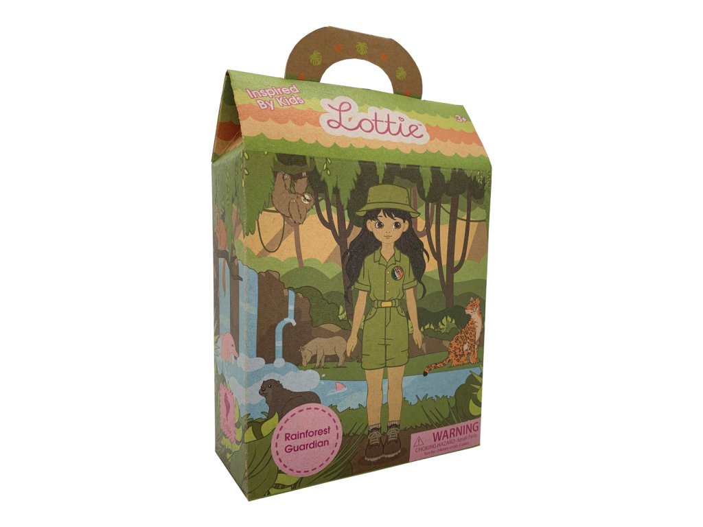 Se svým dalekohledem a lupou je připravena zkoumat a strážit deštný prales, který je domovem mnoha ohrožených zvířat a rostlin. Příroda přece skýtá tolik dobrodružství, proto je potřeba ji chránit. Ve spolupráci s organizací Rainforest Trust přichází kolekce Lottie s panenkou, která děti prostřednictvím sady kartiček provede vzácnou Amazonskou přírodou. Jako ostatní panenky z oceňované kolekce Lottie je i tato realistická a snaží se děti naučit upřímnému pohledu na svět. Lottie jsou navrženy a zvláště uzpůsobeny malým dětským ručkám, mají pohyblivá kolena a jsou vyrobeny z prémiového měkkého vinylu a nylonu, bez použití ftalátů. Každá panenka je dodávána v atraktivní barevné kartónové taštičce s plastovým průhledem a uchem. Hlavní vlastnosti:kloubová panenka s pohyblivými koleny, perfektní pro představivou hruprémiové nylonové vlasy jsou hebké na dotek a nezamotávají sepanenka z vinylu bez obsahu ftalátů, měkká na dotekpanenka má snímatelné boty a stojí samostatněhnědé vlasy a hnědé očimilované všemi dětmi, vhodné od 3 letmalá a roztomilá panenka ve velikosti 18 cm Balení obsahuje:Lottie, milovnice zvířat a strážkyně parku, vybavená zelenou kombinézou s páskem, bílými ponožkami, hnědými botami a kloboučkemdalekohled, lupa a 10 sběratelských kartiček