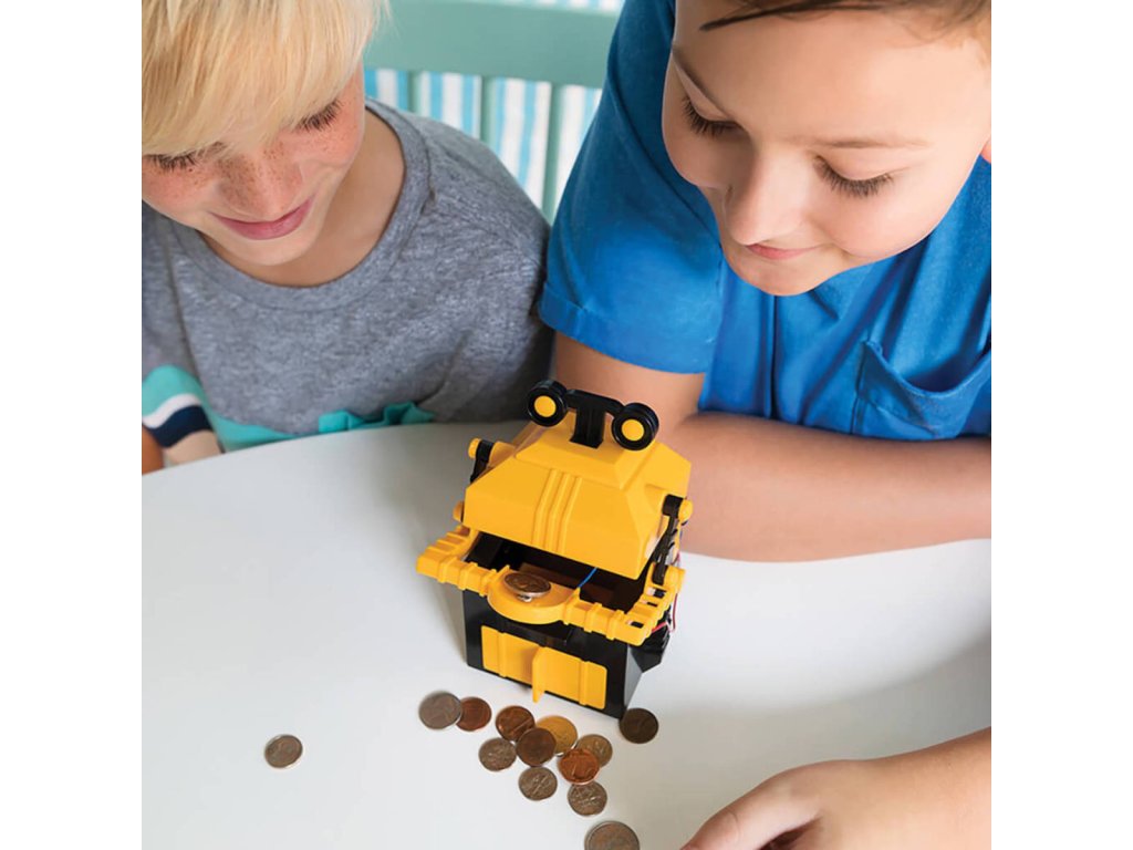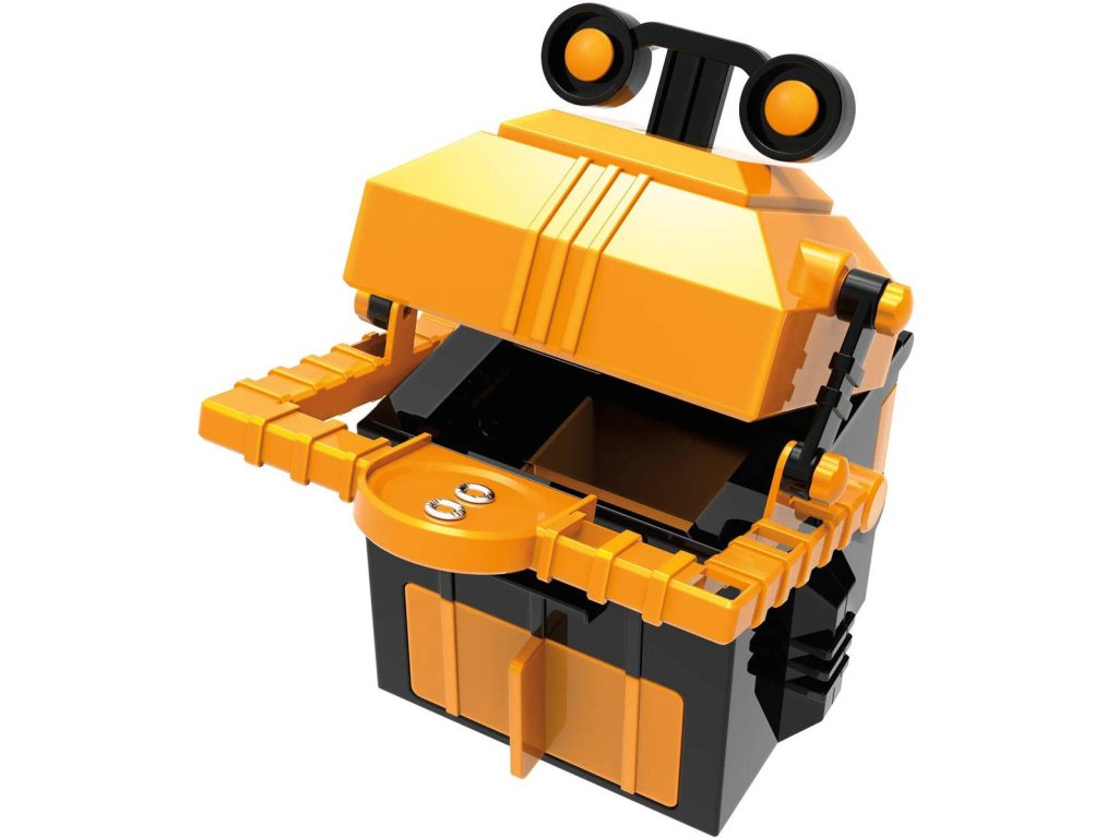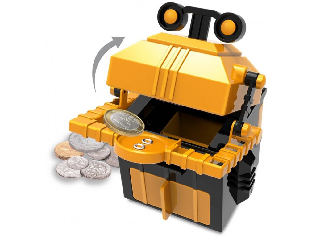 Sestavte si originální pokladničku v podobě robota. Když položíte na jeho natažené ruce minci, tak vám ji sní :-) Penízky lze snadno vyndat vysunutím šuplíčku, do kterého padají.