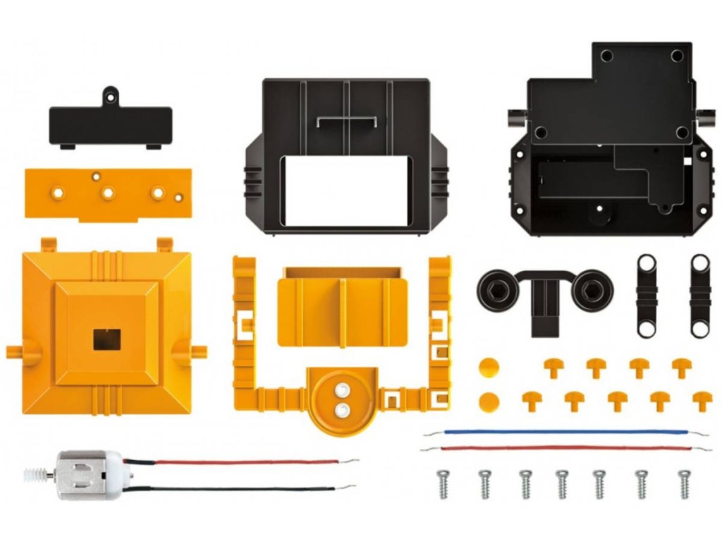 Obsah balení: sada plastových dílů, motor, dráty, 10 šroubů, krytky svorek, převody, podrobný návod.
