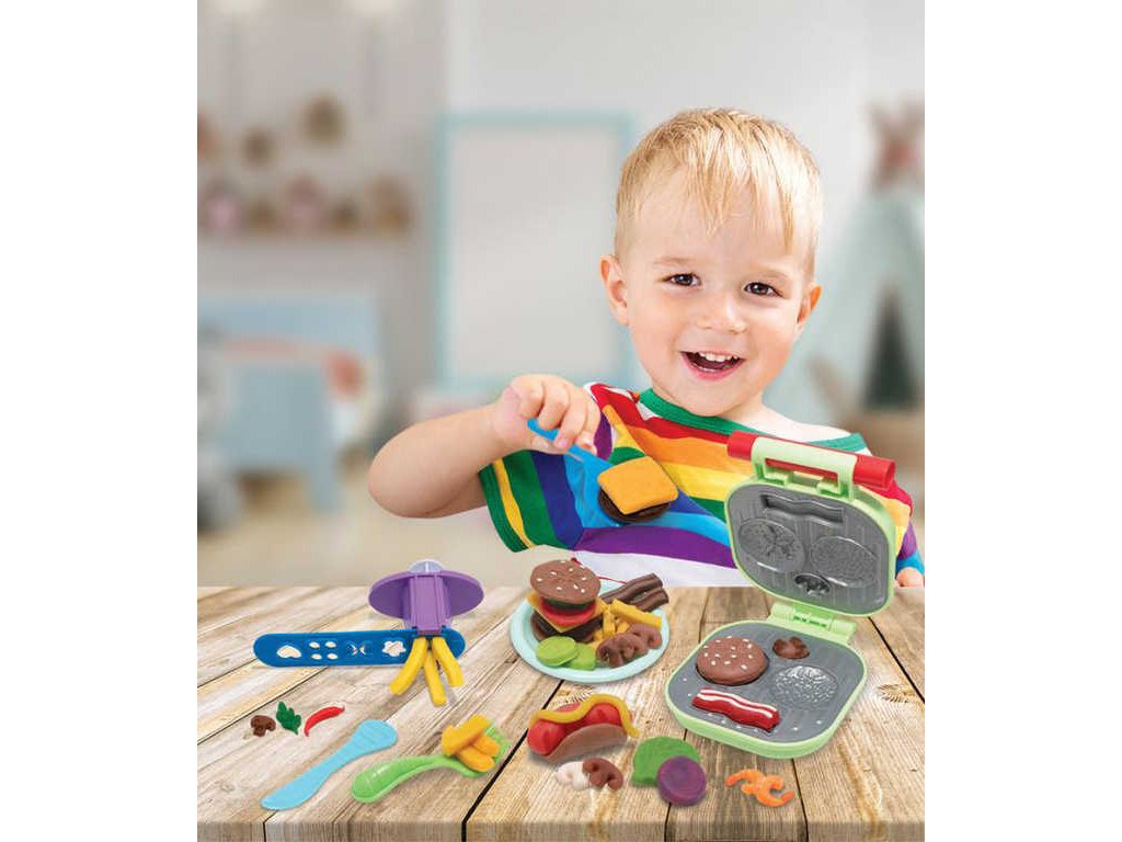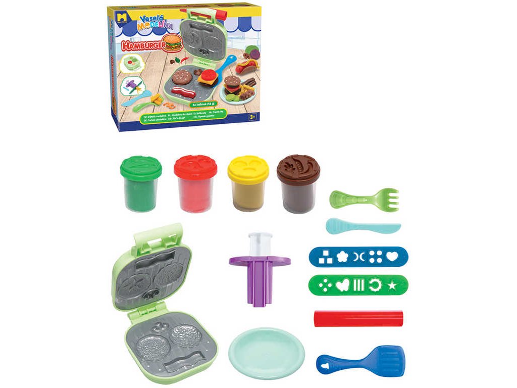 Parádní herní set s modelínou pro všechny malé kuchaře a milovníky rychlého občerstvení. Za pomocí různých vytlačovátek a dalších nástrojů si můžete snadno a rychle vyrobit vlastní hamburger, hranolky a