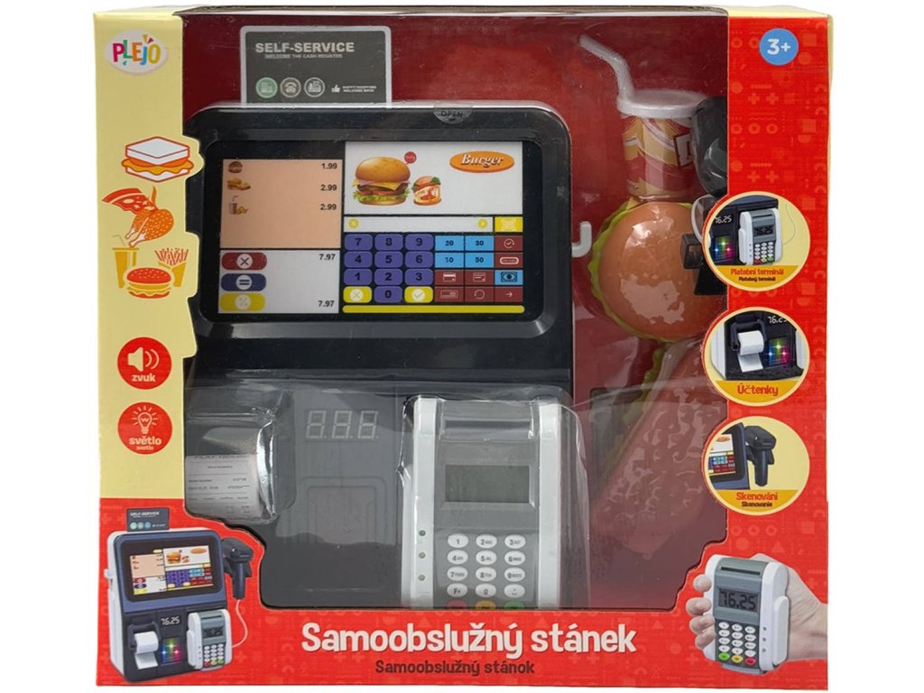 Plejo samoobslužný stánek: Staň se šéfem svého obchodu! Součástí platební terminál, skener, umělé jídlo a platební karta. Hračka na baterie, se světlem a zvukem.
