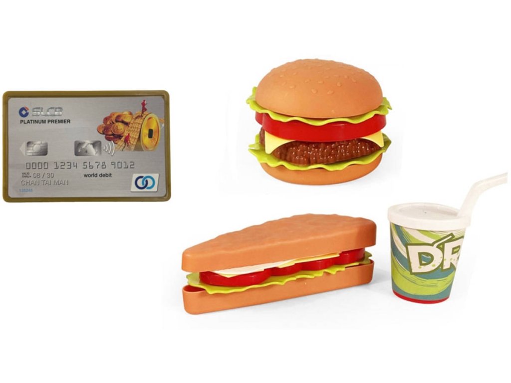 Velká samoobslužná pokladna: Zákazníci si na ní můžou naklikat, co chtějí – třeba šťavnatý hamburger, křupavý sendvič nebo osvěžující pitíčko. A hele, všechno tohle jídlo najdeš rovnou v balení!