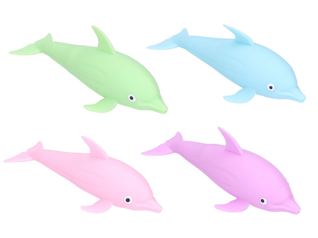 Mačkací delfín. Rozměry 16x7 cm. 12 ks display box. Světelné efekty. Neměnitelná vestavěná baterie. Více barevných variant. 4 varianty- modrá, zelená, růžová, fialová. Vestavěná baterie, nelze měnit.