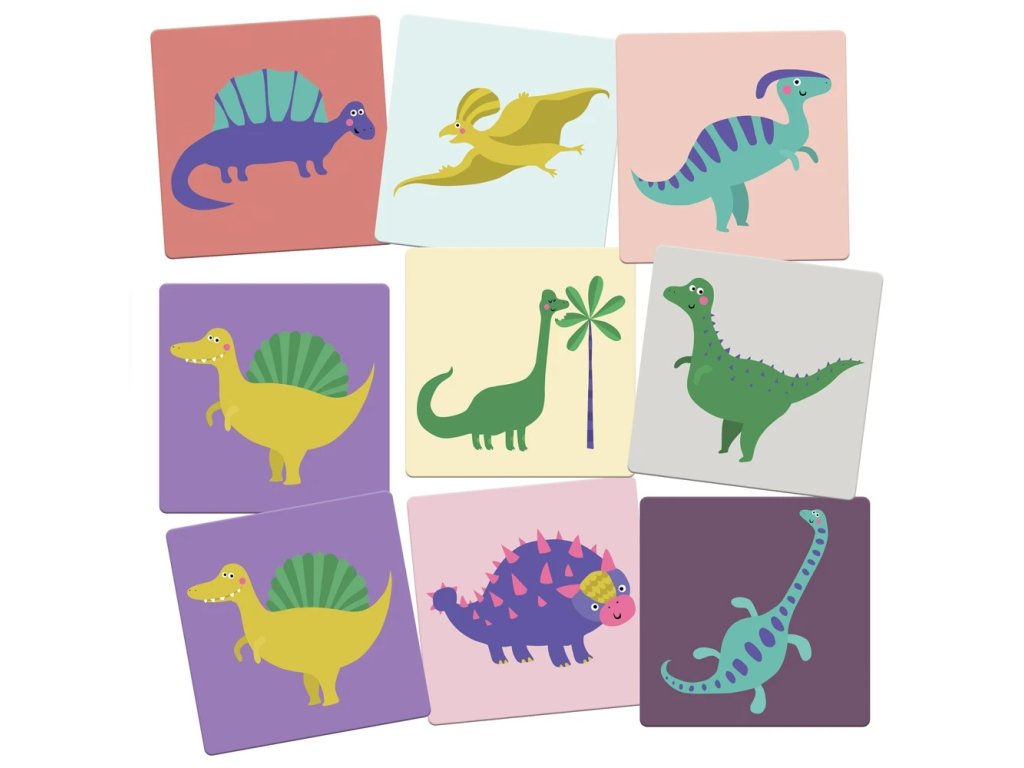 Tady je T-Rex, tam leží Stegosaurus... Kdepak se skrývá pterodaktyl? Pro tuto klasickou hru je nutná nejenom dobrá paměť, ale i trpělivost. Kdo najde mezi skrytými kartami nejvíce dvojic obrázků, vyhrává! Hlavní vlastnosti: rozvíjí logické myšlenítrénuje postřeh a paměť dětí