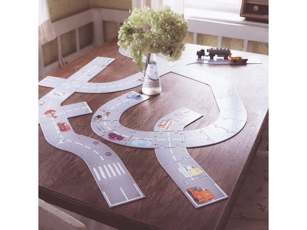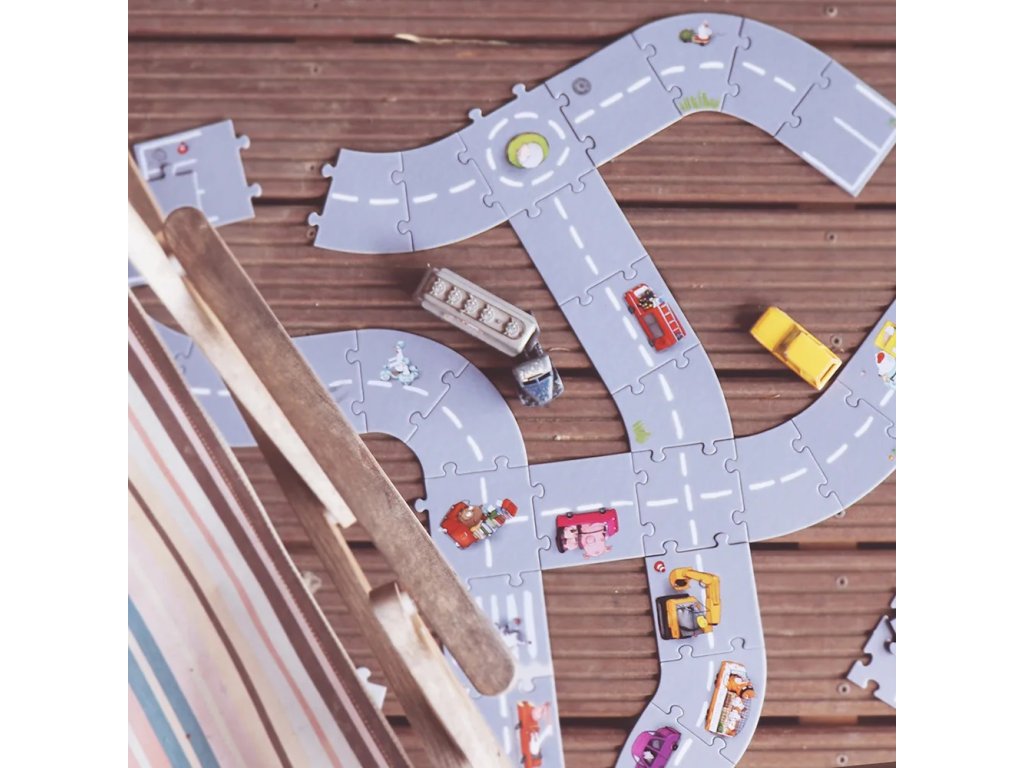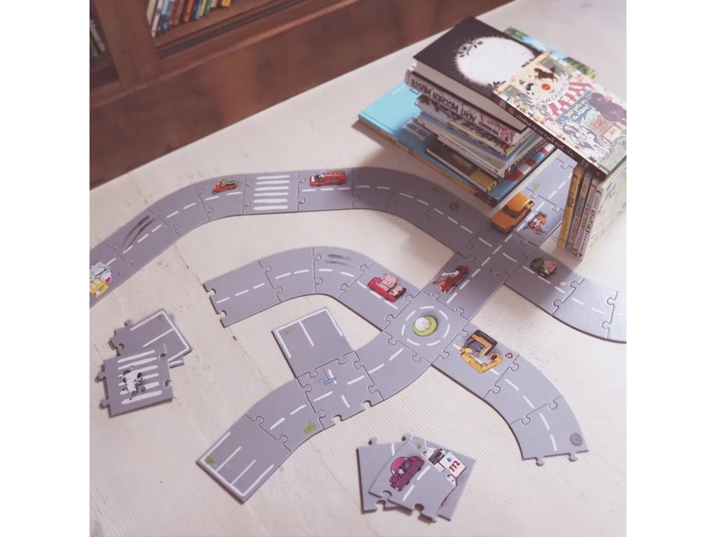 V téhle ulici se každou chvílí něco děje! Zúčastněte se se zvířátky vzrušujícího závodu a nebojte se šlápnout na pedál! Předběhněte velrybí mládě v jeho akváriu, vyhněte se čtoucí sově s nebezpečně se houpající hromadou knih- jen dávejte pozor na neposedné chodce... Ať už je to křižovatka, kruhový objezd, zatáčka nebo rovinka – s díly šikovného formátu si děti od 4 let mohou postavit vlastní silnici tak, jak se jim zlíbí, a přitom pořádat zábávné závody i v bezpečí svého pokojíku. Hlavní vlastnosti: rozvíjí představivost a koncentracizlepšuje obratnost a koordinaci ruka-oko