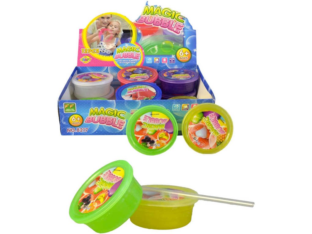 Krabička s metalickou, třpytivou hmotou, šest barevných variant. Součástí je brčko, za pomoci kterého můžeš z této zábavné hmoty vykouzlit parádní bubliny.