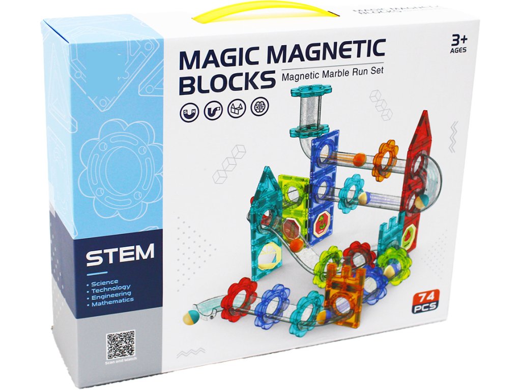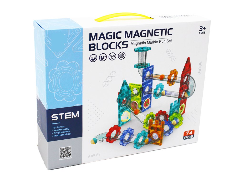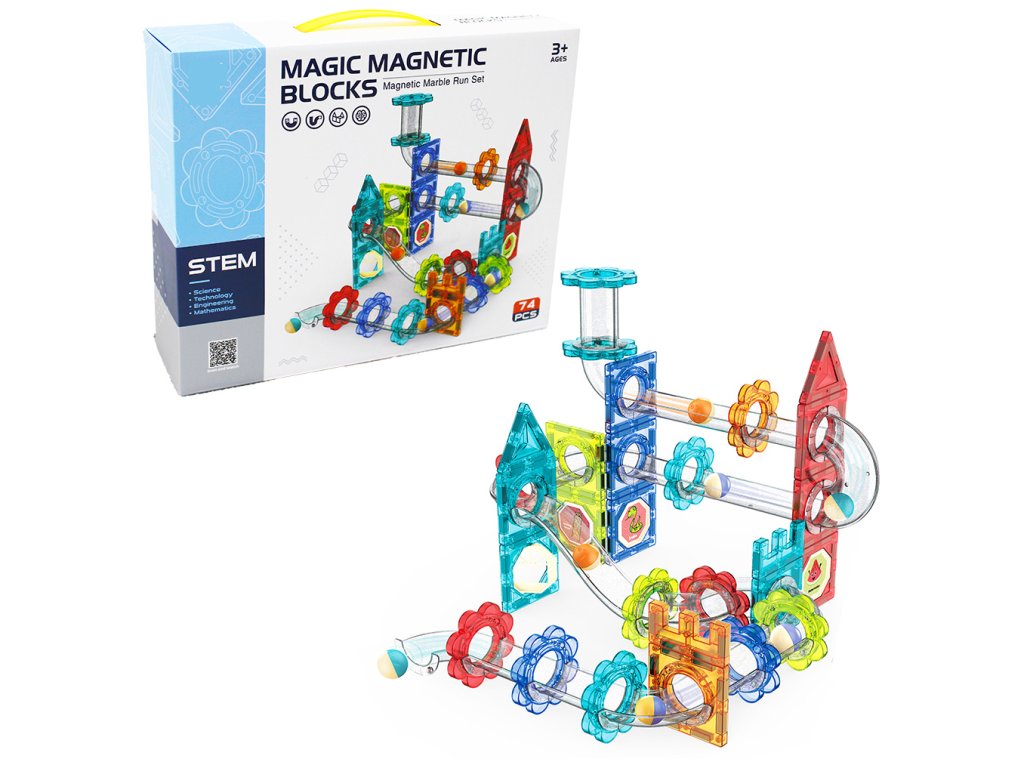 Obsah balení: 74 dílků stavebnice (přesný počet jednotlivých dílů dle obrázku na obalu) Magnetické spojovací prvky Kuličky pro dráhu Bezpečnostní upozornění: Nevhodné pro děti do 3 let Obsahuje malé části - nebezpečí spolknutí nebo vdechnutí Obsahuje magnety - při spolknutí nebezpečné V případě spolknutí magnetů okamžitě vyhledejte lékaře Důležitá upozornění: Před hrou zkontrolujte kompletnost a stav všech dílů Poškozené díly nepoužívejte Při zjištění závady ji odstraňte nebo hračku nepoužívejte Obal uschovejte pro další použití Před použitím: Odstraňte veškerý obalový materiál Pozor na nebezpečí udušení igelitovým obalem Zkontrolujte všechny díly stavebnice Další informace: Barvy a detaily se mohou lišit od vyobrazení na obalu Doporučujeme dohled dospělé osoby při hře Stavebnici skladujte na bezpečném místě mimo dosah malých dětí Údržba: Pravidelně kontrolujte stav všech dílů Udržujte stavebnici čistou a kompletní Magnety udržujte v dobrém stavu