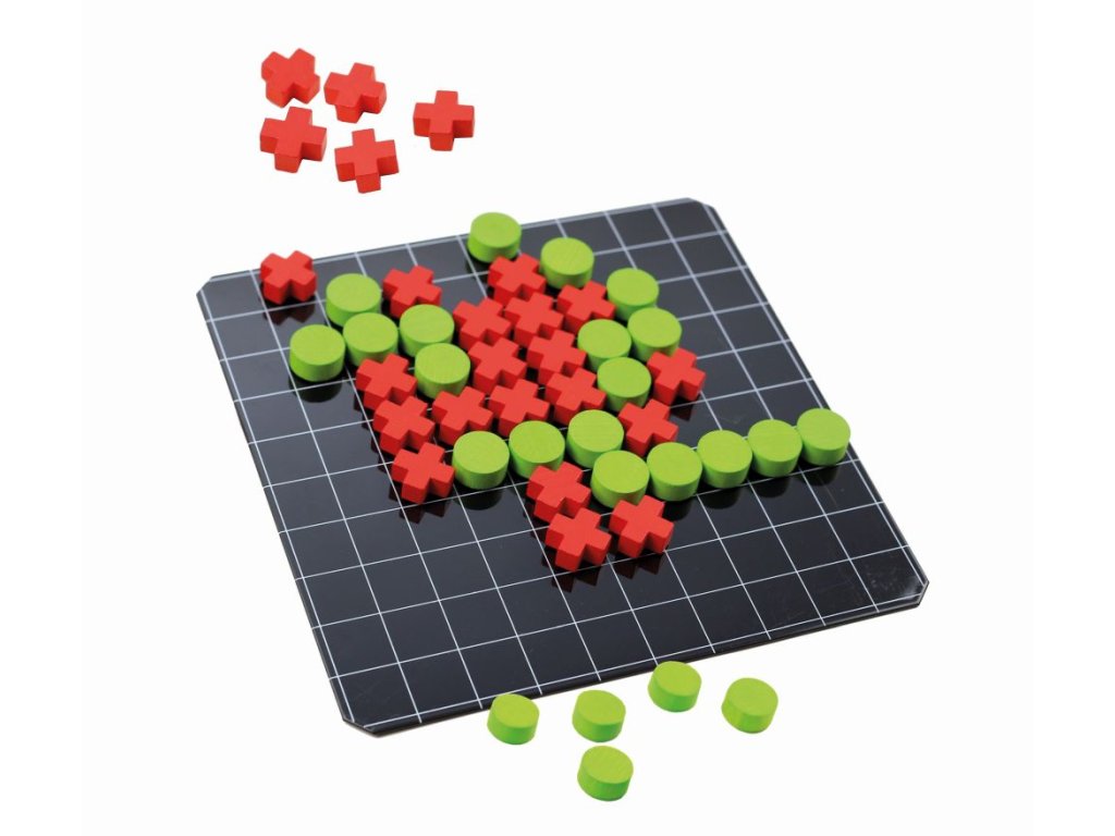 Oblíbená strategická hra pro dva hráče v cestovním provedení. Hra obsahuje plechovou tabulku o rozměrech 165x165 mm a dřevěné herní kameny (kolečka O 15 mm a kříže 16x16 mm) podlepené magnetem.