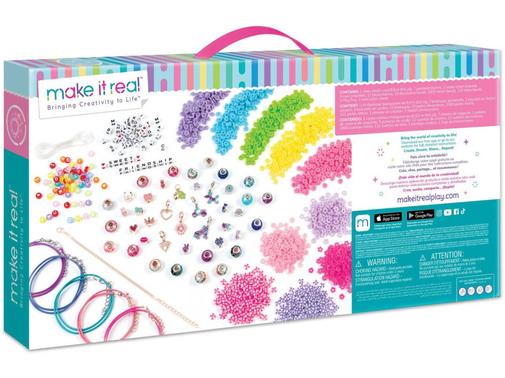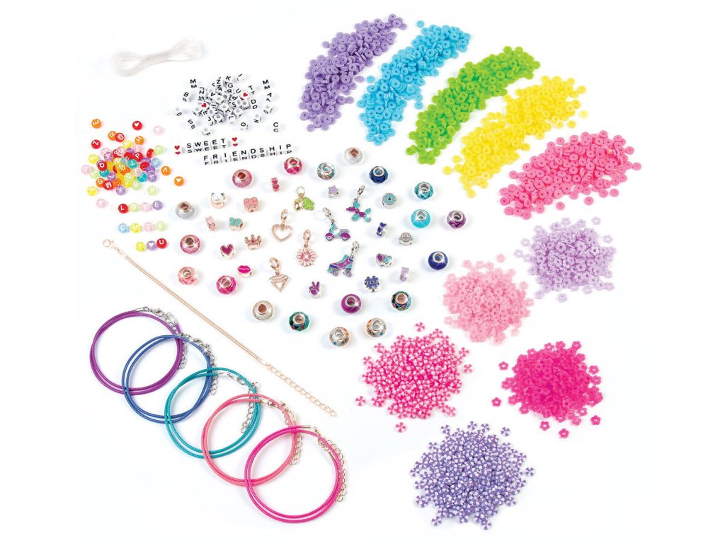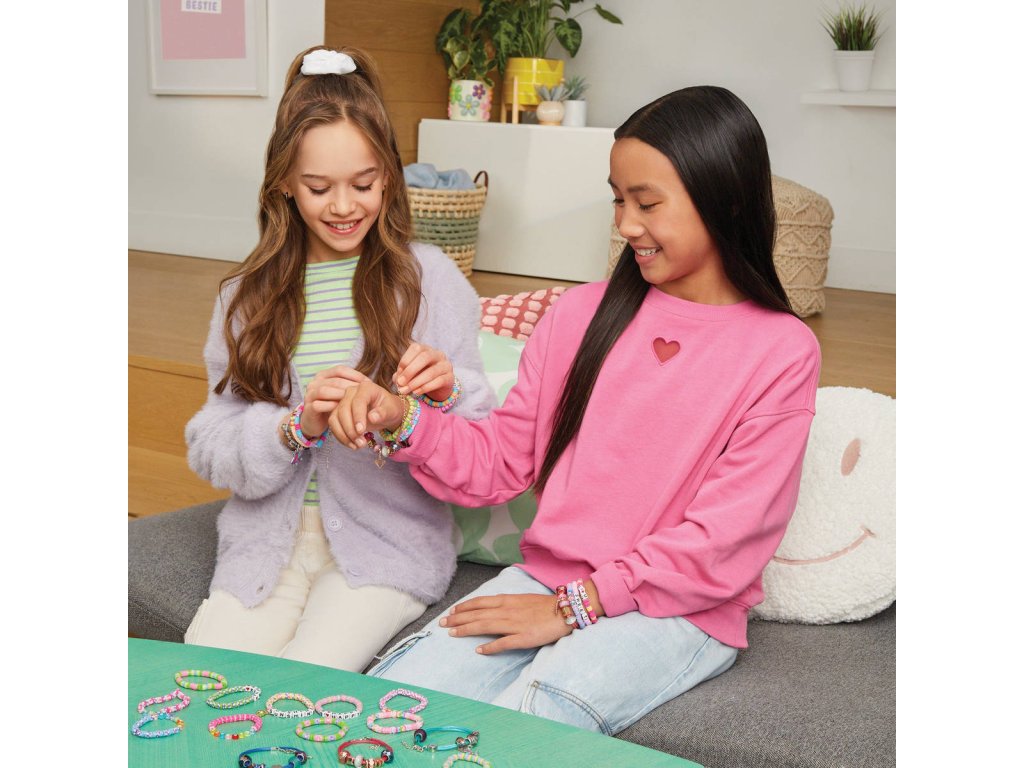 Vytvářej náramky podle nejnovějších módních trendů! S touto sadou můžeš vyrobit více než 30 náramků pomocí přiložených šňůrek, řetízků, různých přívěsků a více než 2100 korálků. Využij celou nabídku halo přívěsků, heishi korálků a písmenkových korálků k výrobě přátelských náramků a vyměňuj je s kamarády… možnosti jsou nekonečné!