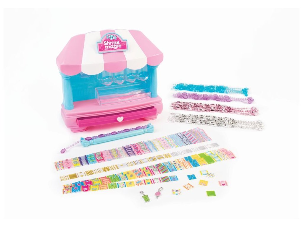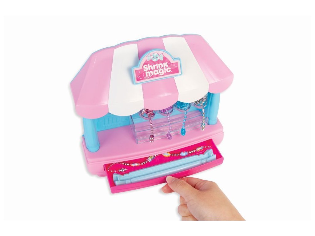 Cukrárna Shrink Magic Candy Shop je místo, kde se vyrábějí pamlsky na nošení, a kouzlo je ve smršťovači! Vybírejte, posouvejte a zmenšujte obaly a vytvořte tyto sladké a barevné doplňky! Vyberte pramen korálků, poté vyberte obaly s designem cukroví a zarovnejte je na korálky.