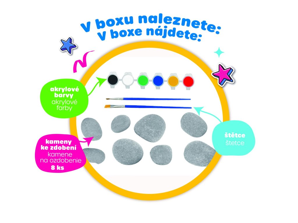 Tento set přináší dětem možnost proměnit obyčejné kamínky v originální barevná dílka. Stačí vzít štětec, barvy a nechat pracovat fantazii.