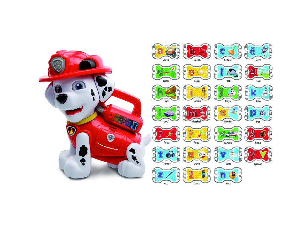 Marshall - Písmenková hostina. Naučte se společně s Marshallem poznat písmena české abecedy. Marshallovi stačí vložit do tlamičky kostičku a on hned pozná jaké písmenko je na kostičce vyobrazeno. Marshall ale také zkouší, jestli už písmena poznáte sami. Např. vás vyzve: „Pomož mi prosím najít a zachránit písmeno Č“. Když jste splnili úkol dobře, tak vás pochválí a navíc třeba přidá slovo, ve kterém se písmeno používá. Například: „Č – jako Čert“. A tak dále. To ale není zdaleka vše, co Marshall umí. Dokáže použít i vybrané písmenko nejen ve slovech, ale i v celých větách. Například pro slovo čert si vymyslí větu: „Každý přece ví, že čerti nejsou. Nebo jsou?“ Marshall také dokonale pozná barvy, které jsou na kostech vyobrazeny, stejně tak i pojmenuje obrázky z každé kostičky. Víte jaké písmeno, je v abecedě před „R“? Ne?. Potom se zeptejte Marshalla. Ten to zaručeně ví a naučí to i vás! Marshall dokonce i zahraje známé melodie a veškerou svojí činnost doprovází rozkošným mrkáním a hýbáním uší! Marshall zná více jak 500 různých frází, které Vás zabaví na hodně, hodně, hodně dlouhou dobu! Příjemnou zábavu s Marshall - Písmenková hostina Vám přeje VTECH. Pro děti od 3 let. Rozměr 30x30x10cm. 2x AA baterie jsou součástí balení.
