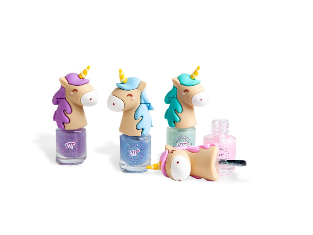 MARTINELIA Lak na nehty Jednorožec. Pro odstranění použijte mýdlo a teplou vodu. 24ks v display boxu. 4 varianty: růžová, modrá, zelená, fialová