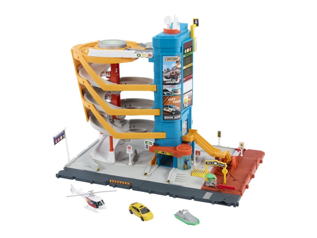 Vydejte se na vzrušující dobrodružství na zemi, ve vzduchu nebo na moři s dopravním centrem Matchbox™. Tento velkolepý herní set obsahuje pětiúrovňovou garáž, přístaviště lodí a přistávací plochu pro vrtulníky a jeho součástí je taxík, loď a vrtulník v měřítku 1:64 pro realistické vyprávění příběhů.