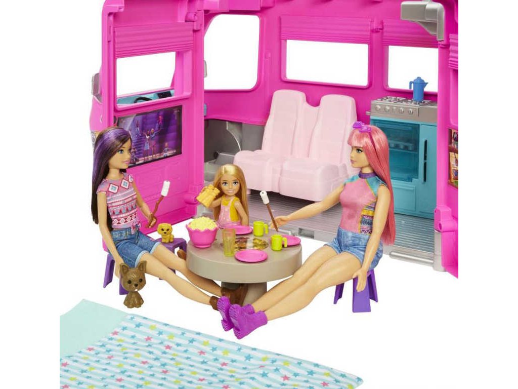 S Barbie Karavanem snů s obří skluzavkou si užijete dokonalé kempování! Děti mohou karavan naložit a odjet do vysněné destinace - pojízdná kola a dvoumístná kabina inspirují k realistické hře.
