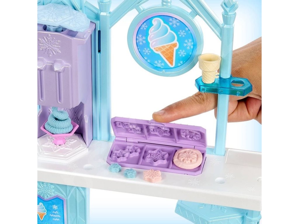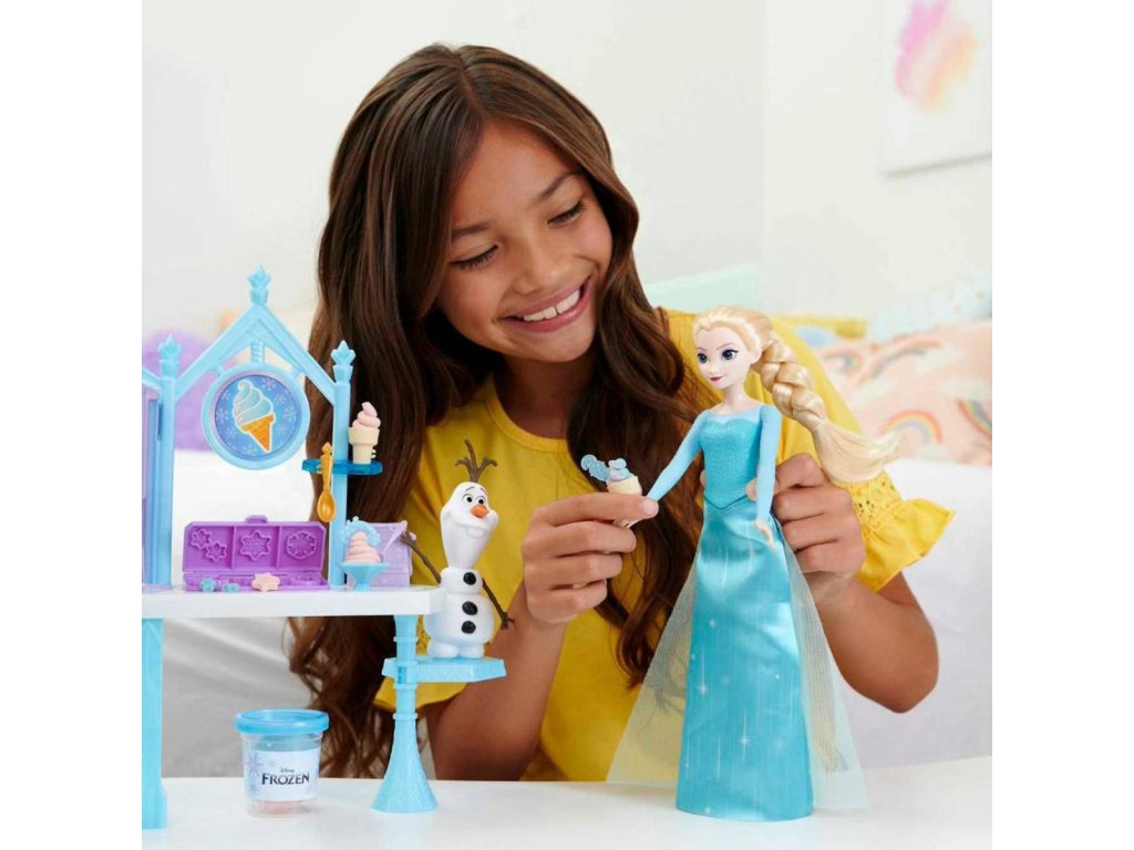 Herní set Zmrzlinárna. Součástí modelína, panenka Elsa, postavička Olaf a doplňky a nástroje pro vytváření zmrzliny.