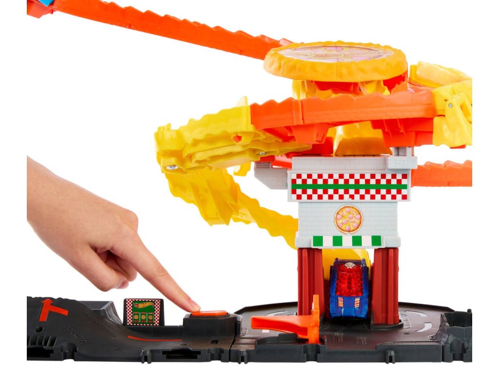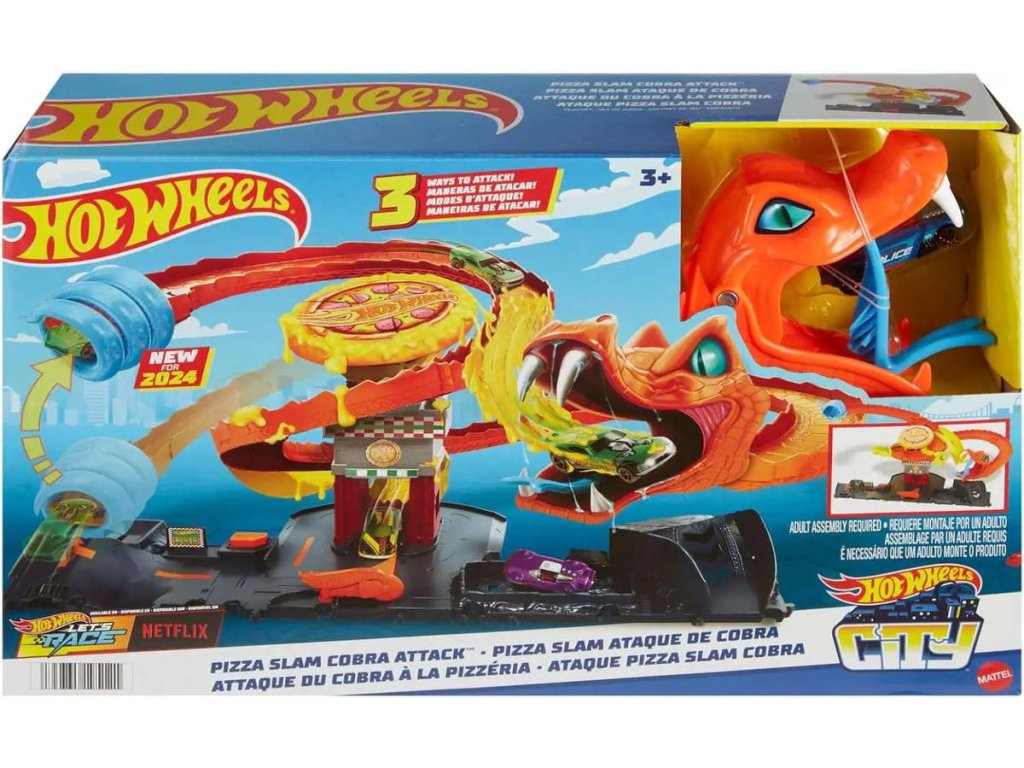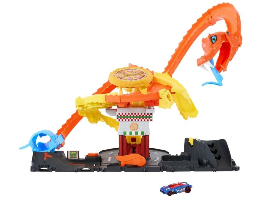 Postavte se hladové kobře, která se vplížila do pizzerie, a zachraňte Hot Wheels City stejně jako v seriálu Let`s Race od Netflixu! Najeďte kobře na ocas a pusťte ji, abyste zjistili, kterou ze tří náhodných cest se auto vydá. Prožene se kobří tlamou a skončí v popelnici? Možná ho čeká nešťastná jízda, která skončí v tlamě tvora. Nebo možná vyšle pizzu do tváře kobry a porazí ji! Sada obsahuje parádní detaily dráhy, které inspirují k vyprávění příběhů a lze ji připojit k dalším sadám Hot Wheels City. Každá se prodává samostatně. Součástí balení je jedno autíčko Hot Wheels. Barvy a provedení dekorací se mohou lišit.