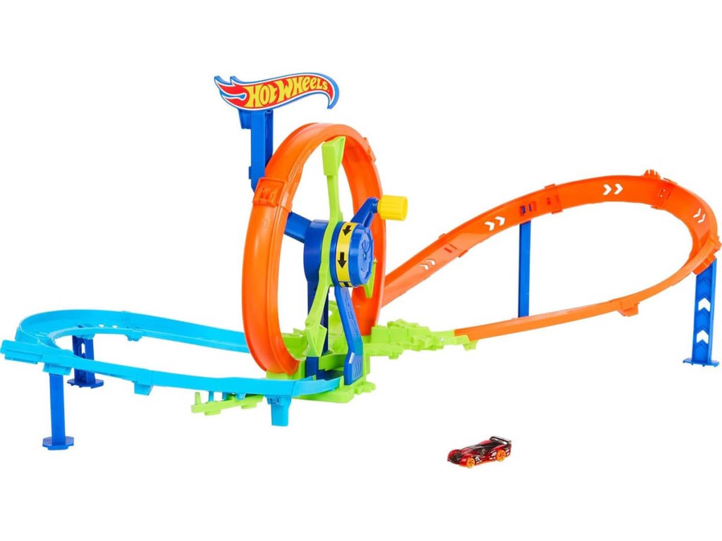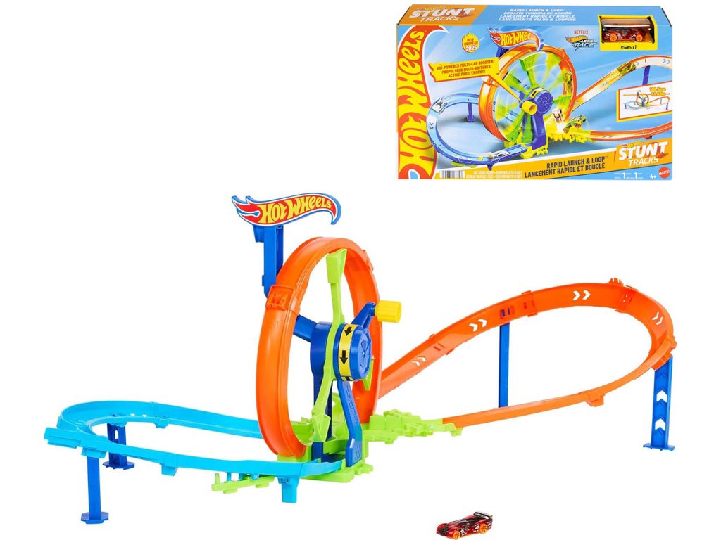 Hrací sada Hot Wheels Rapid Launch & Loop Playset obsahuje kolo s klikou, které opakovaně pohání autíčka přes smyčku, zatáčky a nárazovou zónu. Otoč klikou, abys poháněl kolečko ve smyčce, a pak vhoď přiložené autíčko v měřítku 1:64. Sleduj, jak znovu a znovu projíždí smyčkou a dvěma zatáčkami. Zvyšte vzrušení přidáním dalších autíček, která se budou muset vyhýbat smyčce kicker a dalším autům v nárazové zóně (součástí balení je jedno vozidlo Hot Wheels; další autíčka se prodávají samostatně).