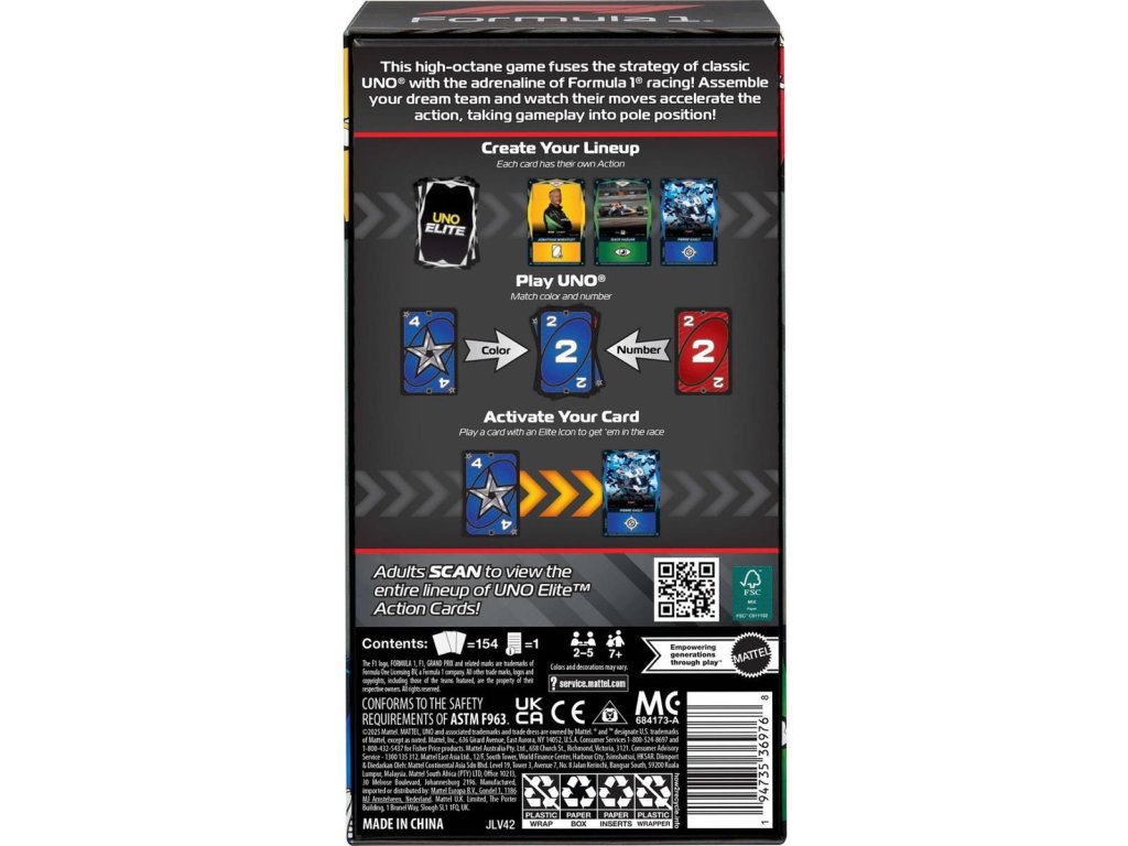 Tradiční hra UNO kombinuje speciální karty "Akční karta elitních jezdců", které zobrazují jezdce, auta i helmy ze světa Formule 1. Zařaďte tyto karty do svého týmu a přidejte tak do klasické hry vzrušující nové akce. Barvy a vzhled výrobku se mohou lišit.