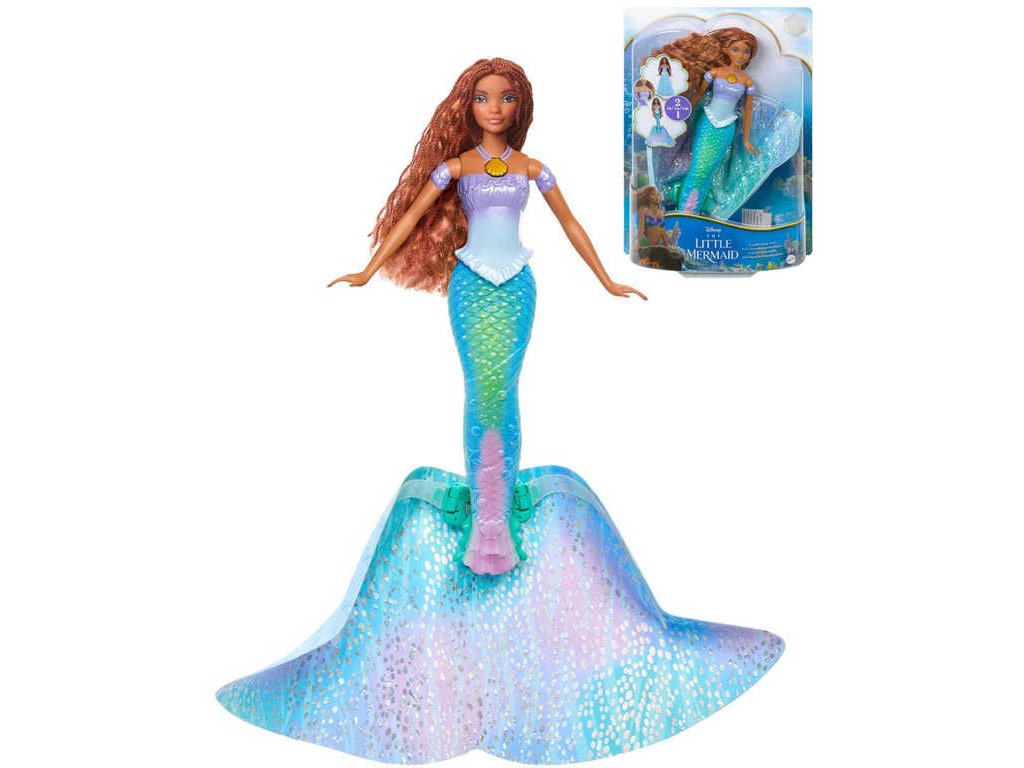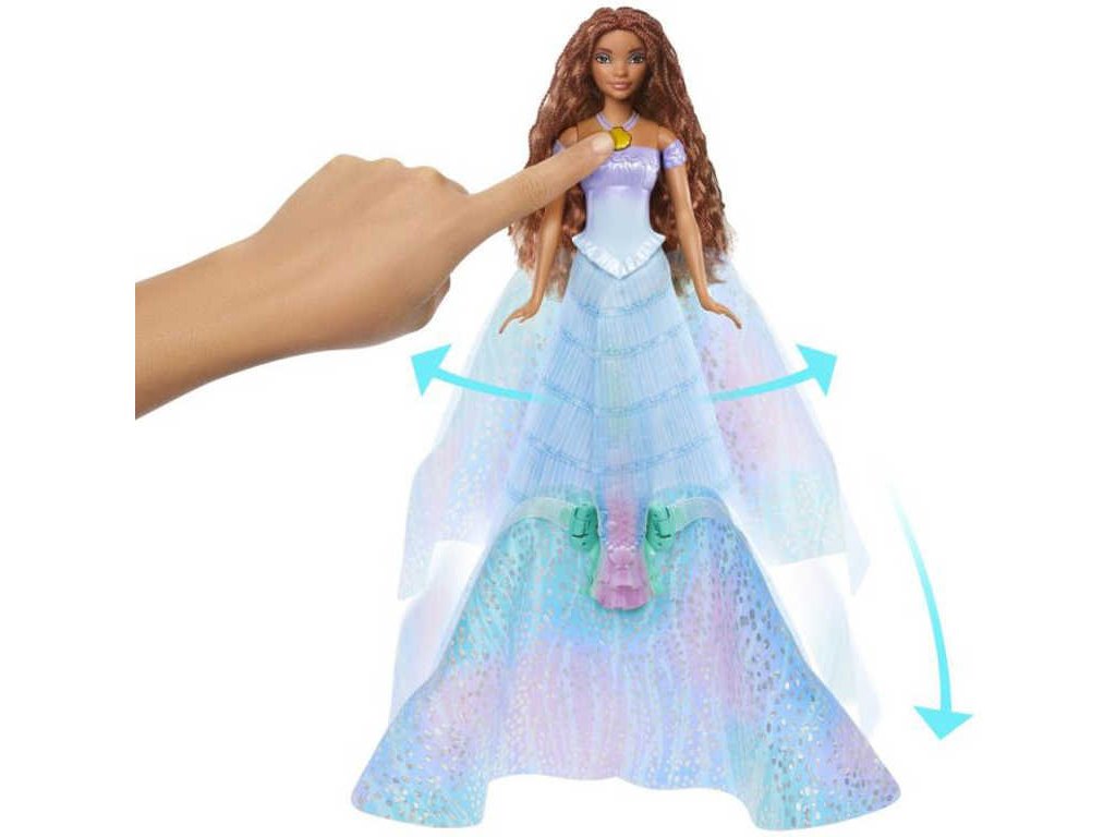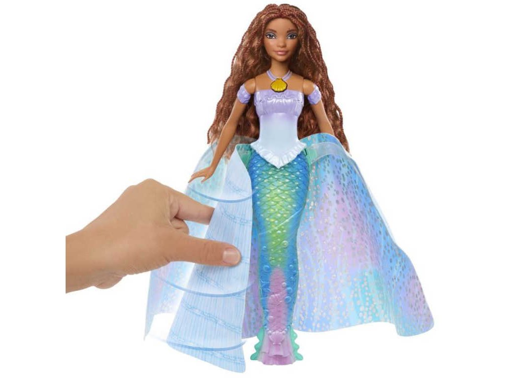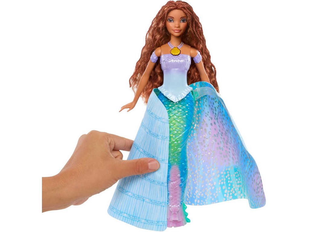 Prozkoumejte kouzelný svět Malé mořské víly novým způsobem! Panenka Malá mořská víla s kouzelnou proměnou je inspirovaná hraným filmem společnosti Disney. Panenka nabízí úžasnou proměnu z princezny na mořskou vílu a to stisknutím tlačítka na panence. Panenka má v podobě princezny modrou lesklou sukni a v podobě mořské víly ocasní ploutev.