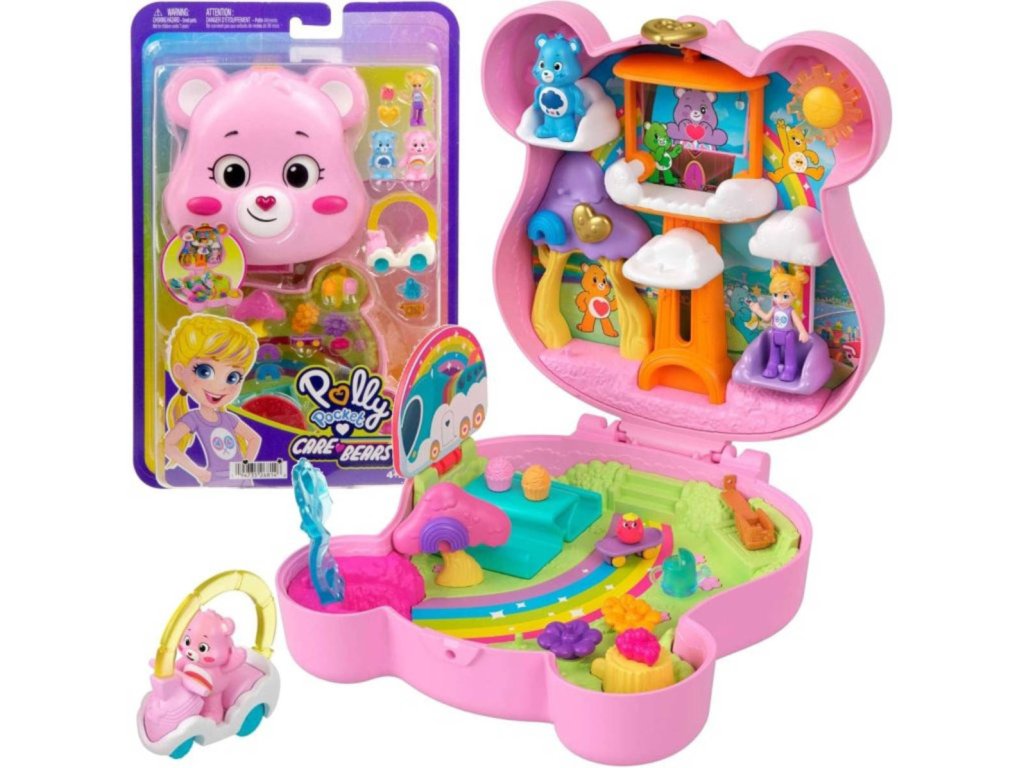 Kompaktní sada Polly Pocket " Care Bears " je přenosná hračka, která po otevření odhalí miniaturní svět inspirovaný oblíbenými postavičkami Care Bear. Má podobu kulaté hlavy medvídka v teplém pastelovém odstínu růžové. Medvídek má okouzlující, veselý výraz, který vybízí ke hře. Jedno oko je široce otevřené a druhé koketně mrká (po stisknutí tlačítka), což mu dodává hravý a přátelský charakter.