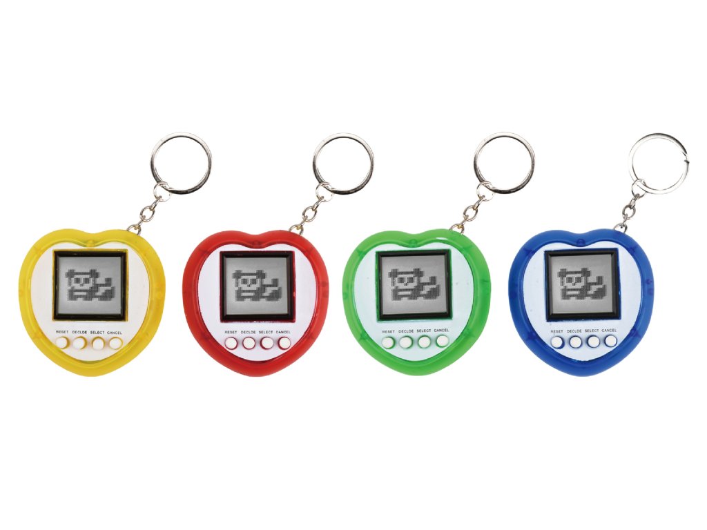 Mazlíček elektronický hra srdce. Rozměry 6,8x6,8x2,6 cm. S kroužkem na klíče. Display box 12 ks. 4 varianty - žlutá, červená, modrá, zelená. Baterie 2xAAA, nejsou součástí. Handheld herní konzole. Je možné si zvolit z velkého množství mazlíčků.