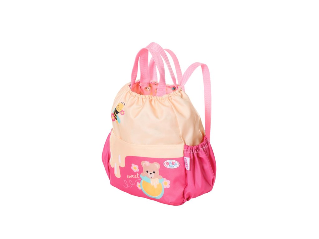 Batůžek v medově žluté a růžové barvě je navržen tak, aby mohl medvídek BABY born během výletu vykukovat ven. Navíc je uvnitř a v obou bočních kapsách dostatek místa na všechno, co medvídek a jeho rodiče potřebují na cestu. Systém růžových popruhů lze přizpůsobit velikosti dítěte.