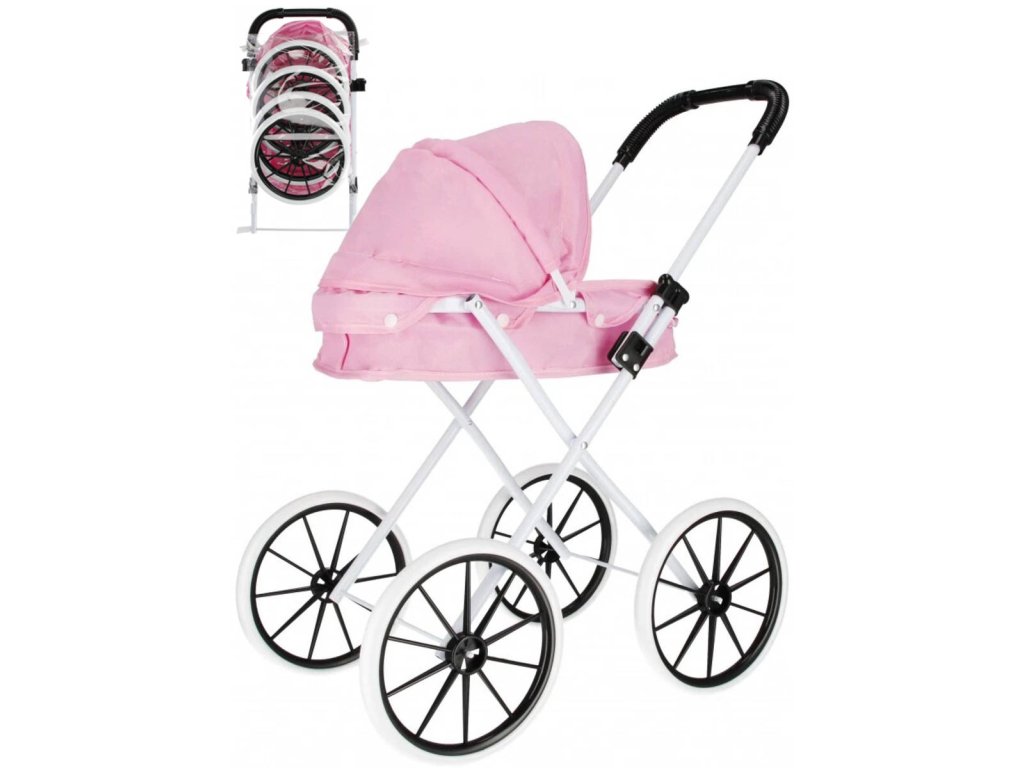MEGA CREATIVE Růžový hluboký kočárek pro panenku miminko. Vyrobeno z kovu, plastu a textilu. Skládací stříška. Velikost: 54 x 63 x 32cm.