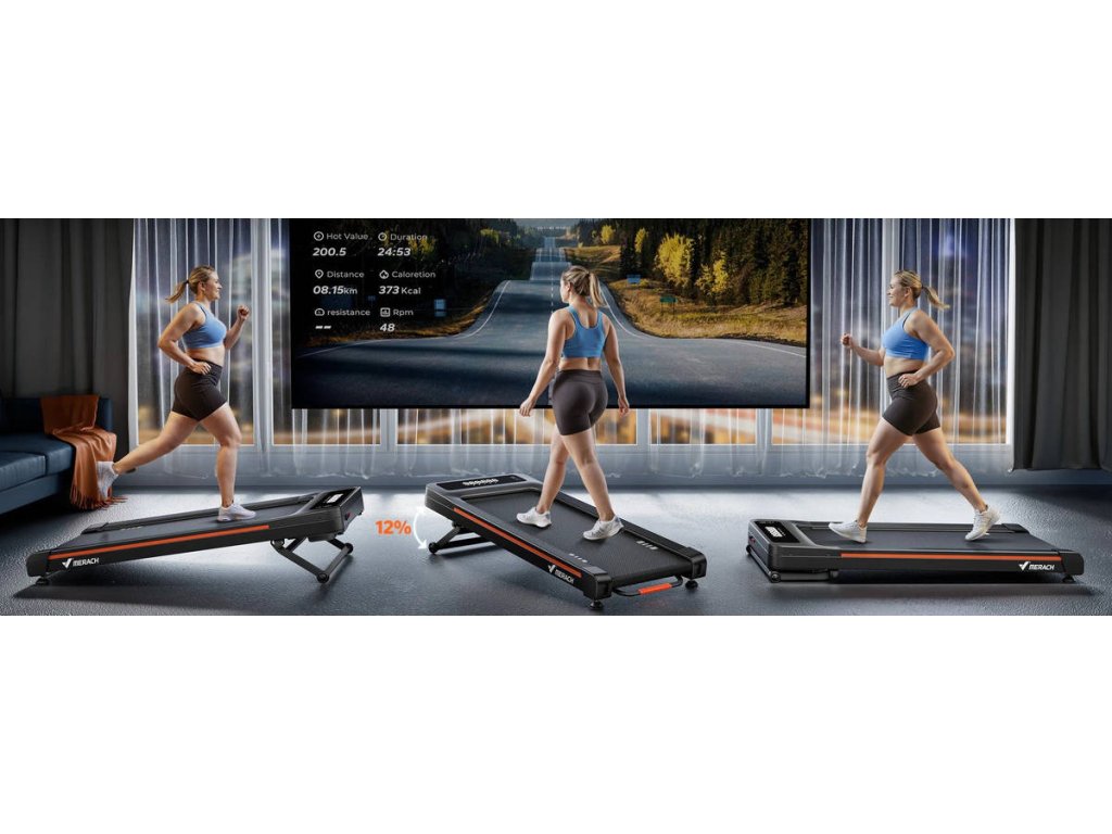 Spalte až o 30 % více kalorií díky plynule nastavitelnému sklonu (0–12 %) pomocí dálkového ovladače. Aktivujte režim stoupání a zaměřte se na hýždě – ideální pro rehabilitační trénink nebo domácí HIIT.