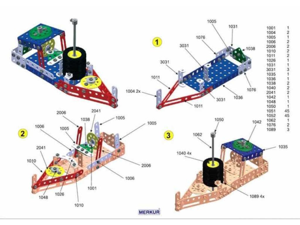 matiček. Součástí stavebnice je návodová knížka s návodem na stavbu 30 různých modelů jako je pásová pila, vagón, jeřáb, nákladní auto, výtah atd. Na začátku návodové knížky jsou popsány a