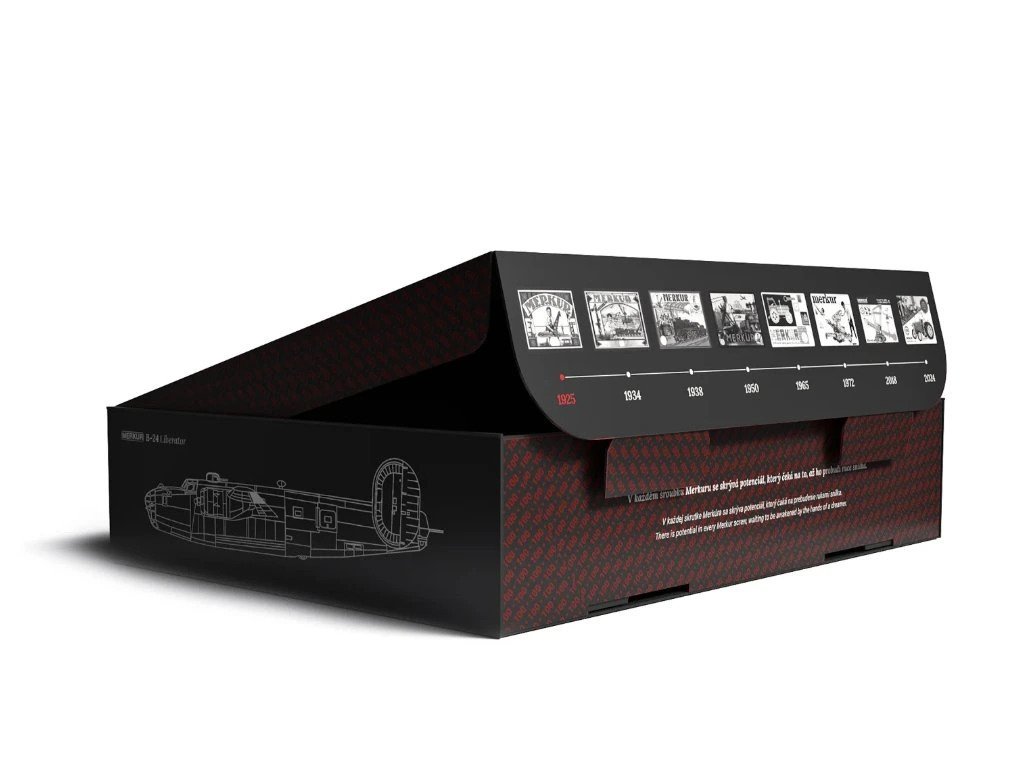 Oslav 100 let české stavebnice Merkur unikátním modelem Merkur B-24 Liberator. Limitovaná série 2 500 ks s podepsaným certifikátem a krásnou brožurou s příběhem českého letce Františka Švejdara z Police nad Metují. Rozpětí křídel impozantních 55,5 cm a 902 dílků potěší sběratele, fanoušky letectví i chytré ruce dětí od 8 let (ideálně s asistencí dospělého).