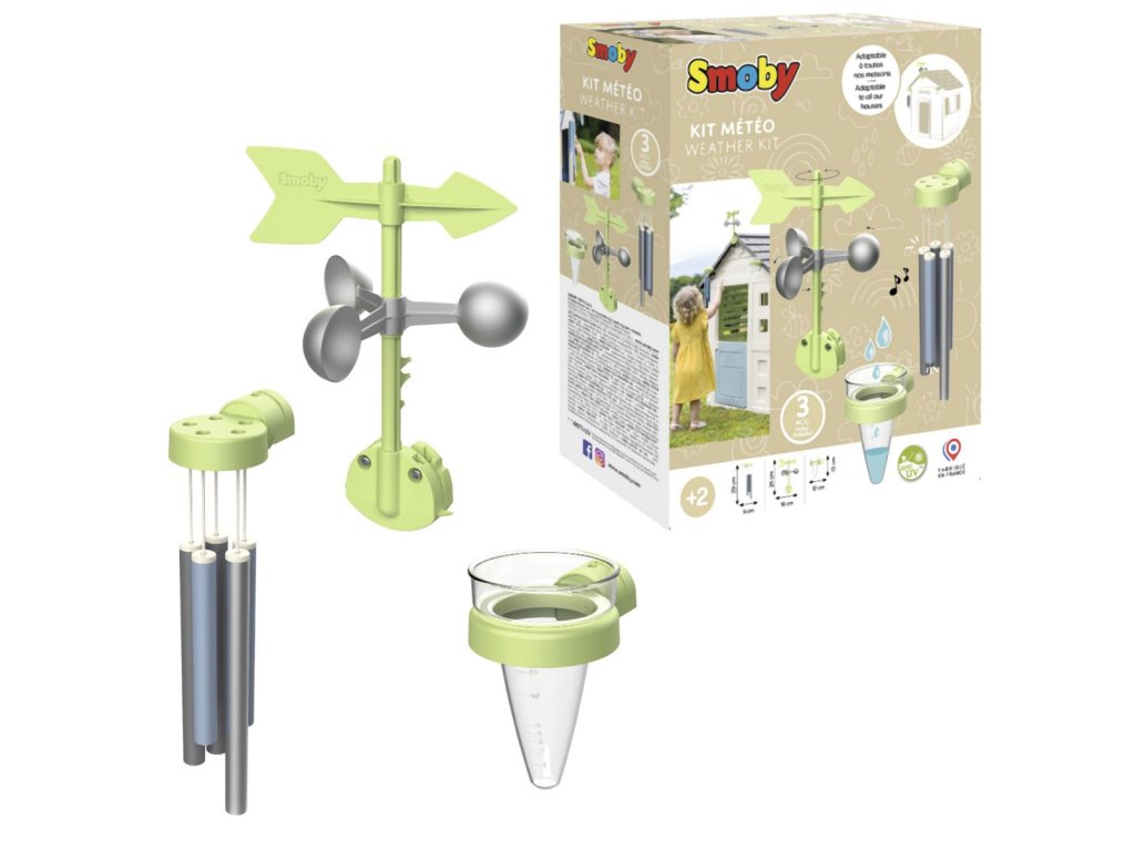 Hrací sada meteorologická stanice ke zkoumání počasí: zvonkohra, větrná korouhvička/anemometr a srážkoměr. Sada je kompatibilní se všemi domečky Smoby. S touto sadou mohou děti objevovat a pozorovat jevy počasí. Lze snadno připevnit. Sada je vyrobena z vysoce kvalitního plastu odolnému vůči UV záření a je zvláště odolná vůči povětrnostním vlivům a vyblednutí.
